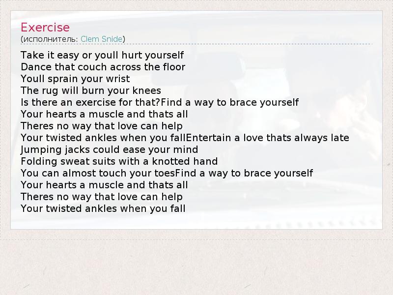 Take it easy or youll hurt yourself Dance that couch across the floor Youll sprain your wrist The rug will burn your knees Is there an exercise for that?Find a way to brace yourself Your hearts a muscle and thats all Theres no way that love can help Your twisted ankles when you fallEntertain a love thats always late Jumping jacks could ease your mind Folding sweat suits with a knotted hand You can almost touch your toesFind a way to brace yourself Your hearts a muscle and thats all Theres no way that love can help Your twisted ankles when you fall