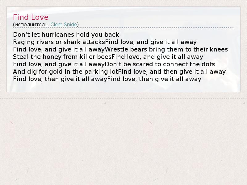 Don't let hurricanes hold you back Raging rivers or shark attacksFind love, and give it all away Find love, and give it all awayWrestle bears bring them to their knees Steal the honey from killer beesFind love, and give it all away Find love, and give it all awayDon't be scared to connect the dots And dig for gold in the parking lotFind love, and then give it all away Find love, then give it all awayFind love, then give it all away