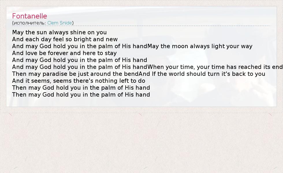 May the sun always shine on you And each day feel so bright and new And may God hold you in the palm of His handMay the moon always light your way And love be forever and here to stay And may God hold you in the palm of His hand And may God hold you in the palm of His handWhen your time, your time has reached its end Then may paradise be just around the bendAnd If the world should turn it's back to you And it seems, seems there's nothing left to do Then may God hold you in the palm of His hand Then may God hold you in the palm of His hand