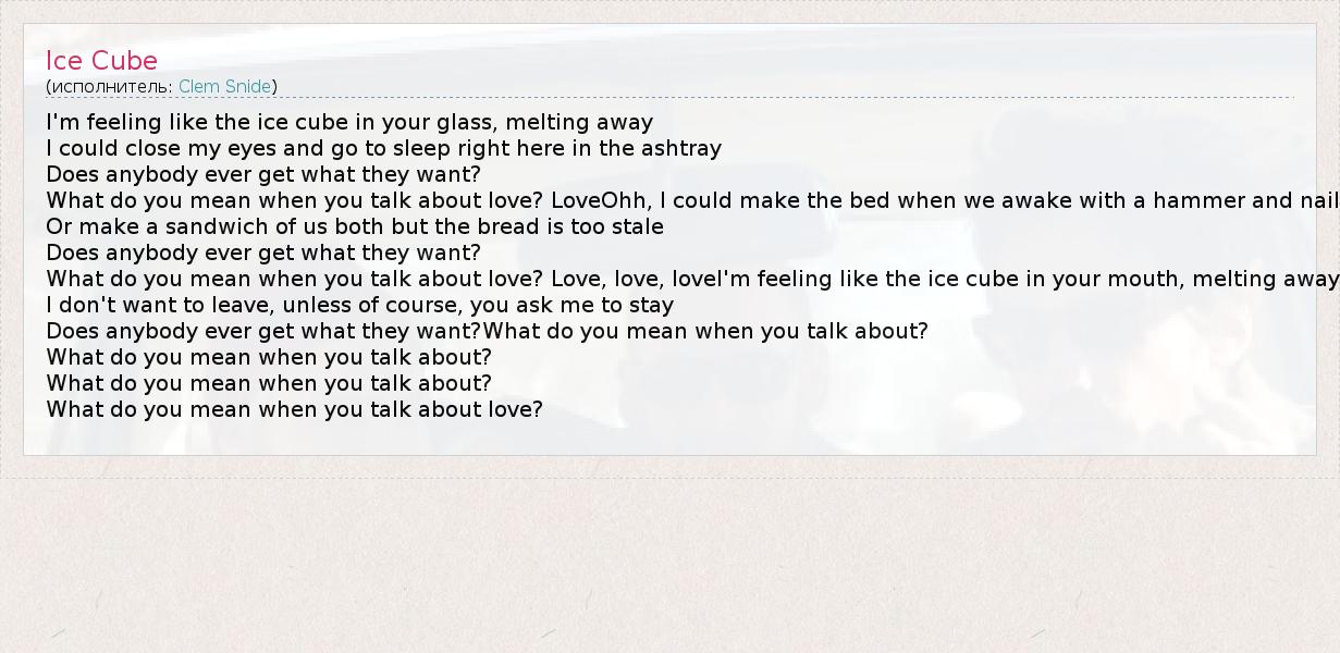I'm feeling like the ice cube in your glass, melting away I could close my eyes and go to sleep right here in the ashtray Does anybody ever get what they want? What do you mean when you talk about love? LoveOhh, I could make the bed when we awake with a hammer and nail Or make a sandwich of us both but the bread is too stale Does anybody ever get what they want? What do you mean when you talk about love? Love, love, loveI'm feeling like the ice cube in your mouth, melting away I don't want to leave, unless of course, you ask me to stay Does anybody ever get what they want?What do you mean when you talk about? What do you mean when you talk about? What do you mean when you talk about? What do you mean when you talk about love?