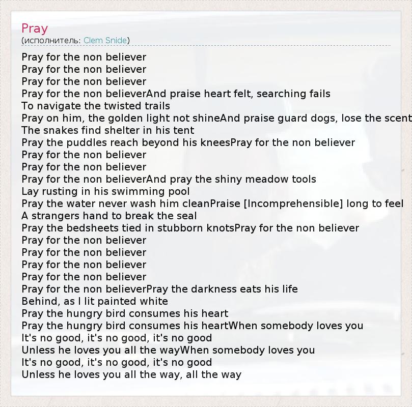 Pray for the non believer Pray for the non believer Pray for the non believer Pray for the non believerAnd praise heart felt, searching fails To navigate the twisted trails Pray on him, the golden light not shineAnd praise guard dogs, lose the scent The snakes find shelter in his tent Pray the puddles reach beyond his kneesPray for the non believer Pray for the non believer Pray for the non believer Pray for the non believerAnd pray the shiny meadow tools Lay rusting in his swimming pool Pray the water never wash him cleanPraise [Incomprehensible] long to feel A strangers hand to break the seal Pray the bedsheets tied in stubborn knotsPray for the non believer Pray for the non believer Pray for the non believer Pray for the non believer Pray for the non believer Pray for the non believerPray the darkness eats his life Behind, as I lit painted white Pray the hungry bird consumes his heart Pray the hungry bird consumes his heartWhen somebody loves you It's no good, it's no good, it's no good Unless he loves you all the wayWhen somebody loves you It's no good, it's no good, it's no good Unless he loves you all the way, all the way