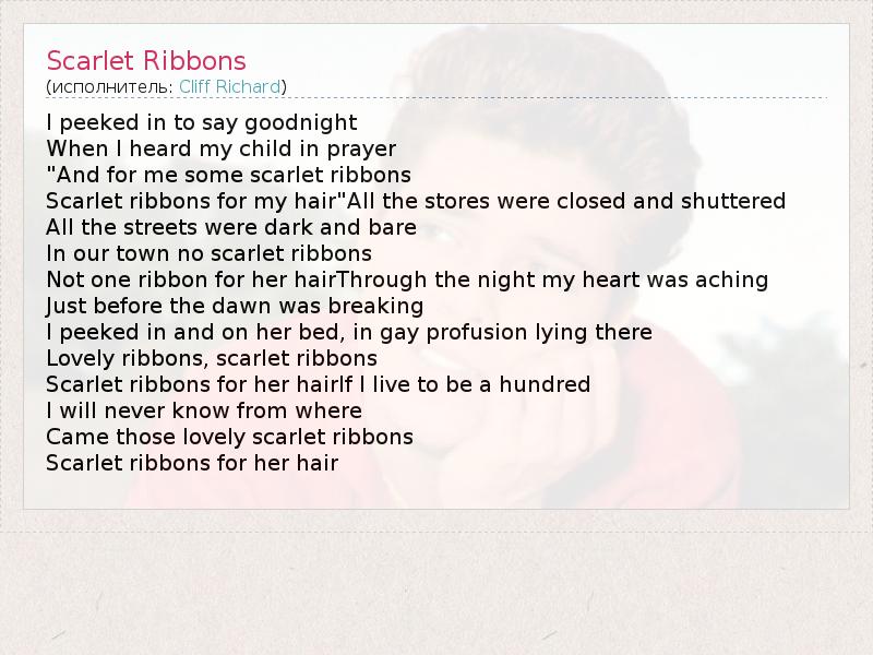 I peeked in to say goodnight When I heard my child in prayer "And for me some scarlet ribbons Scarlet ribbons for my hair"All the stores were closed and shuttered All the streets were dark and bare In our town no scarlet ribbons Not one ribbon for her hairThrough the night my heart was aching Just before the dawn was breaking I peeked in and on her bed, in gay profusion lying there Lovely ribbons, scarlet ribbons Scarlet ribbons for her hairIf I live to be a hundred I will never know from where Came those lovely scarlet ribbons Scarlet ribbons for her hair