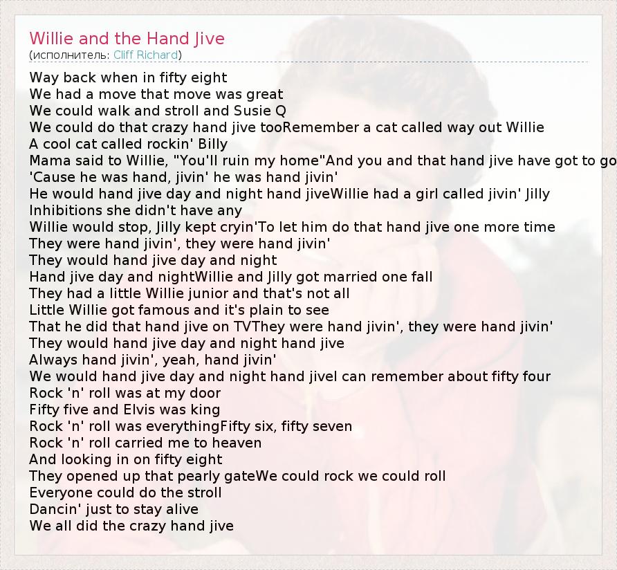 He would hand jive day and night hand jiveWillie had a girl called jivin' Jilly