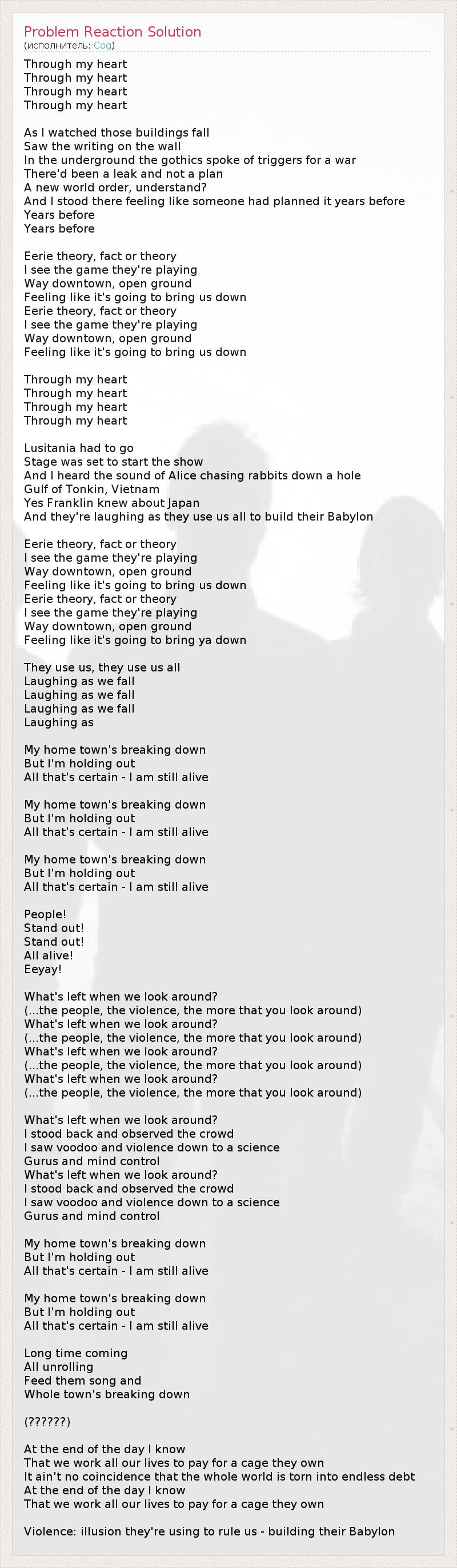 А как ты думаешь, о чем песня "Problem Reaction Solution" ?