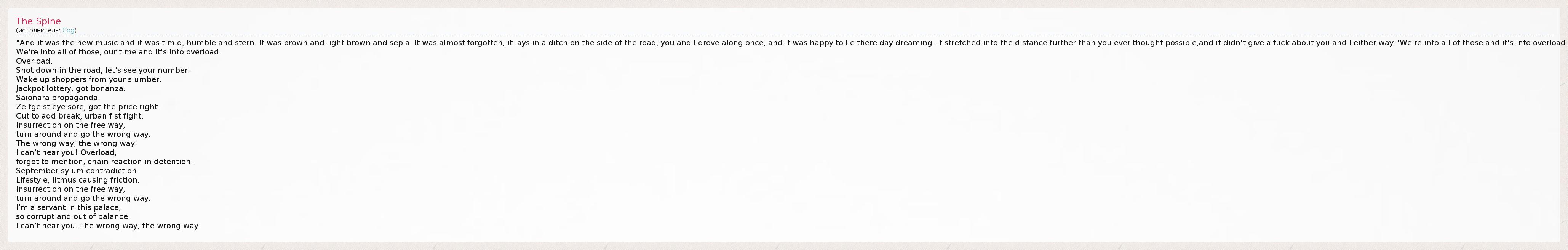 "And it was the new music and it was timid, humble and stern. It was brown and light brown and sepia. It was almost forgotten, it lays in a ditch on the side of the road, you and I drove along once, and it was happy to lie there day dreaming. It stretched into the distance further than you ever thought possible,and it didn't give a fuck about you and I either way."We're into all of those and it's into overload.