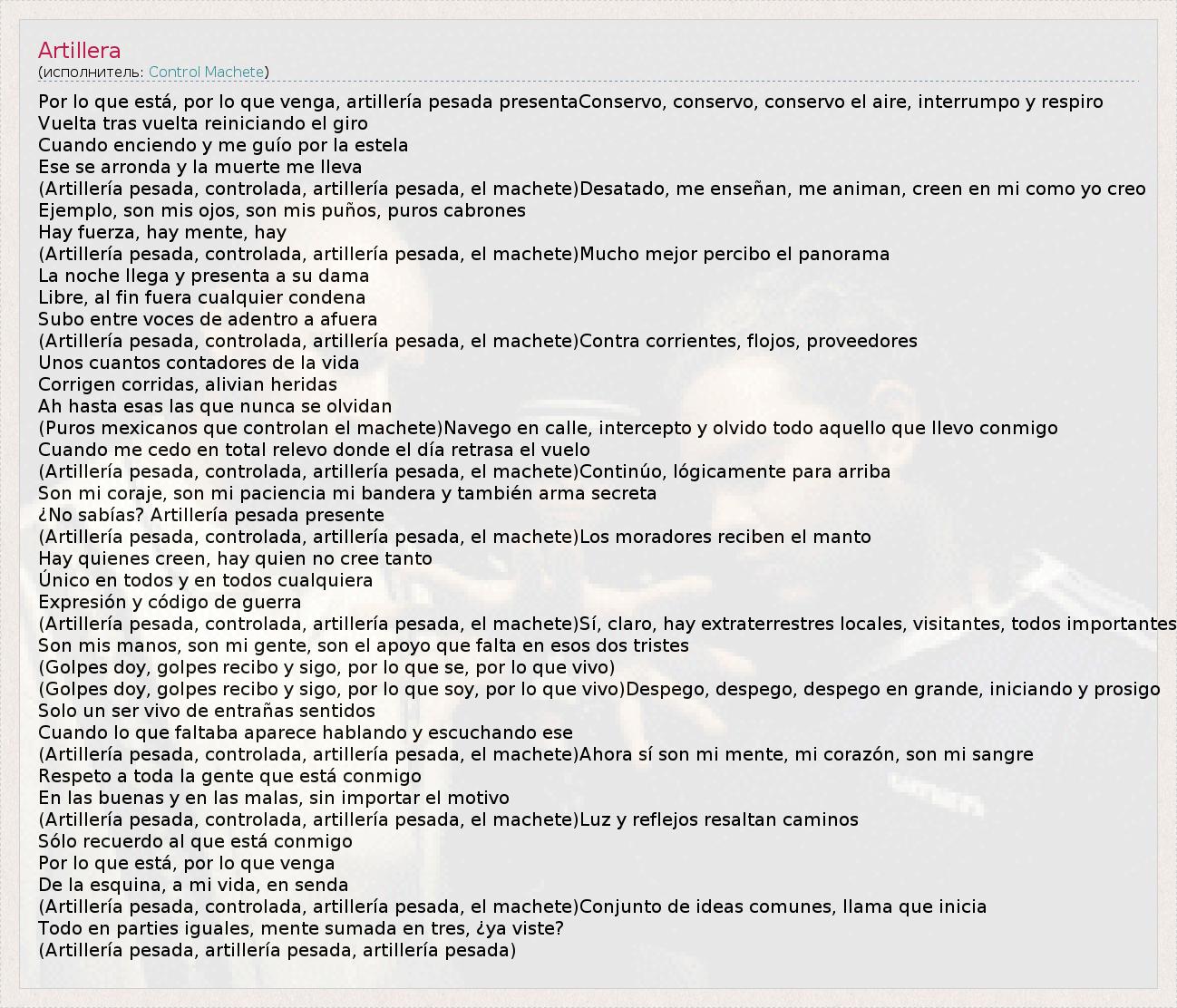 Por lo que está, por lo que venga, artillería pesada presentaConservo, conservo, conservo el aire, interrumpo y respiro Vuelta tras vuelta reiniciando el giro Cuando enciendo y me guío por la estela Ese se arronda y la muerte me lleva (Artillería pesada, controlada, artillería pesada, el machete)Desatado, me enseñan, me animan, creen en mi como yo creo Ejemplo, son mis ojos, son mis puños, puros cabrones Hay fuerza, hay mente, hay (Artillería pesada, controlada, artillería pesada, el machete)Mucho mejor percibo el panorama La noche llega y presenta a su dama Libre, al fin fuera cualquier condena Subo entre voces de adentro a afuera (Artillería pesada, controlada, artillería pesada, el machete)Contra corrientes, flojos, proveedores Unos cuantos contadores de la vida Corrigen corridas, alivian heridas Ah hasta esas las que nunca se olvidan (Puros mexicanos que controlan el machete)Navego en calle, intercepto y olvido todo aquello que llevo conmigo Cuando me cedo en total relevo donde el día retrasa el vuelo (Artillería pesada, controlada, artillería pesada, el machete)Continúo, lógicamente para arriba Son mi coraje, son mi paciencia mi bandera y también arma secreta ¿No sabías? Artillería pesada presente (Artillería pesada, controlada, artillería pesada, el machete)Los moradores reciben el manto Hay quienes creen, hay quien no cree tanto Único en todos y en todos cualquiera Expresión y código de guerra (Artillería pesada, controlada, artillería pesada, el machete)Sí, claro, hay extraterrestres locales, visitantes, todos importantes Son mis manos, son mi gente, son el apoyo que falta en esos dos tristes (Golpes doy, golpes recibo y sigo, por lo que se, por lo que vivo) (Golpes doy, golpes recibo y sigo, por lo que soy, por lo que vivo)Despego, despego, despego en grande, iniciando y prosigo Solo un ser vivo de entrañas sentidos Cuando lo que faltaba aparece hablando y escuchando ese (Artillería pesada, controlada, artillería pesada, el machete)Ahora sí son mi mente, mi corazón, son mi sangre Respeto a toda la gente que está conmigo En las buenas y en las malas, sin importar el motivo (Artillería pesada, controlada, artillería pesada, el machete)Luz y reflejos resaltan caminos Sólo recuerdo al que está conmigo Por lo que está, por lo que venga De la esquina, a mi vida, en senda (Artillería pesada, controlada, artillería pesada, el machete)Conjunto de ideas comunes, llama que inicia Todo en parties iguales, mente sumada en tres, ¿ya viste? (Artillería pesada, artillería pesada, artillería pesada)