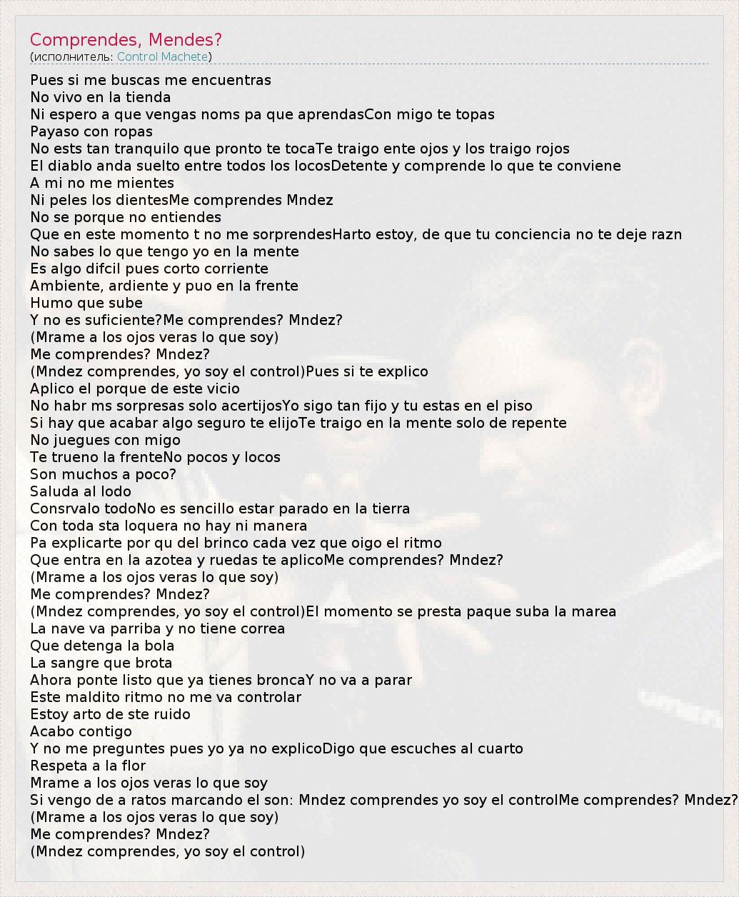 Pues si me buscas me encuentras No vivo en la tienda Ni espero a que vengas noms pa que aprendasCon migo te topas Payaso con ropas No ests tan tranquilo que pronto te tocaTe traigo ente ojos y los traigo rojos El diablo anda suelto entre todos los locosDetente y comprende lo que te conviene A mi no me mientes Ni peles los dientesMe comprendes Mndez No se porque no entiendes Que en este momento t no me sorprendesHarto estoy, de que tu conciencia no te deje razn No sabes lo que tengo yo en la mente Es algo difcil pues corto corriente Ambiente, ardiente y puo en la frente Humo que sube Y no es suficiente?Me comprendes? Mndez? (Mrame a los ojos veras lo que soy) Me comprendes? Mndez? (Mndez comprendes, yo soy el control)Pues si te explico Aplico el porque de este vicio No habr ms sorpresas solo acertijosYo sigo tan fijo y tu estas en el piso Si hay que acabar algo seguro te elijoTe traigo en la mente solo de repente No juegues con migo Te trueno la frenteNo pocos y locos Son muchos a poco? Saluda al lodo Consrvalo todoNo es sencillo estar parado en la tierra Con toda sta loquera no hay ni manera Pa explicarte por qu del brinco cada vez que oigo el ritmo Que entra en la azotea y ruedas te aplicoMe comprendes? Mndez? (Mrame a los ojos veras lo que soy) Me comprendes? Mndez? (Mndez comprendes, yo soy el control)El momento se presta paque suba la marea La nave va parriba y no tiene correa Que detenga la bola La sangre que brota Ahora ponte listo que ya tienes broncaY no va a parar Este maldito ritmo no me va controlar Estoy arto de ste ruido Acabo contigo Y no me preguntes pues yo ya no explicoDigo que escuches al cuarto Respeta a la flor Mrame a los ojos veras lo que soy Si vengo de a ratos marcando el son: Mndez comprendes yo soy el controlMe comprendes? Mndez? (Mrame a los ojos veras lo que soy) Me comprendes? Mndez? (Mndez comprendes, yo soy el control)