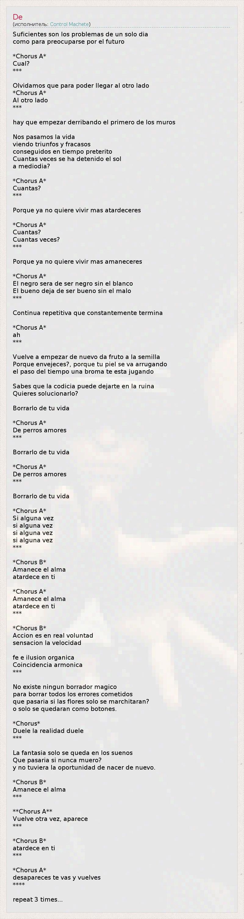 Suficientes son los problemas de un solo dia como para preocuparse por el futuro *Chorus A* Cual? *** Olvidamos que para poder llegar al otro lado *Chorus A* Al otro lado *** hay que empezar derribando el primero de los muros Nos pasamos la vida viendo triunfos y fracasos conseguidos en tiempo preterito Cuantas veces se ha detenido el sol a mediodia? *Chorus A* Cuantas? *** Porque ya no quiere vivir mas atardeceres *Chorus A* Cuantas? Cuantas veces? *** Porque ya no quiere vivir mas amaneceres *Chorus A* El negro sera de ser negro sin el blanco El bueno deja de ser bueno sin el malo *** Continua repetitiva que constantemente termina *Chorus A* ah *** Vuelve a empezar de nuevo da fruto a la semilla Porque envejeces?, porque tu piel se va arrugando el paso del tiempo una broma te esta jugando Sabes que la codicia puede dejarte en la ruina Quieres solucionarlo? Borrarlo de tu vida *Chorus A* De perros amores *** Borrarlo de tu vida *Chorus A* De perros amores *** Borrarlo de tu vida *Chorus A* Si alguna vez si alguna vez si alguna vez si alguna vez *** *Chorus B* Amanece el alma atardece en ti *Chorus A* Amanece el alma atardece en ti *** *Chorus B* Accion es en real voluntad sensacion la velocidad fe e ilusion organica Coincidencia armonica *** No existe ningun borrador magico para borrar todos los errores cometidos que pasaria si las flores solo se marchitaran? o solo se quedaran como botones. *Chorus* Duele la realidad duele *** La fantasia solo se queda en los suenos Que pasaria si nunca muero? y no tuviera la oportunidad de nacer de nuevo. *Chorus B* Amanece el alma *** **Chorus A** Vuelve otra vez, aparece *** *Chorus B* atardece en ti *** *Chorus A* desapareces te vas y vuelves **** repeat 3 times...
