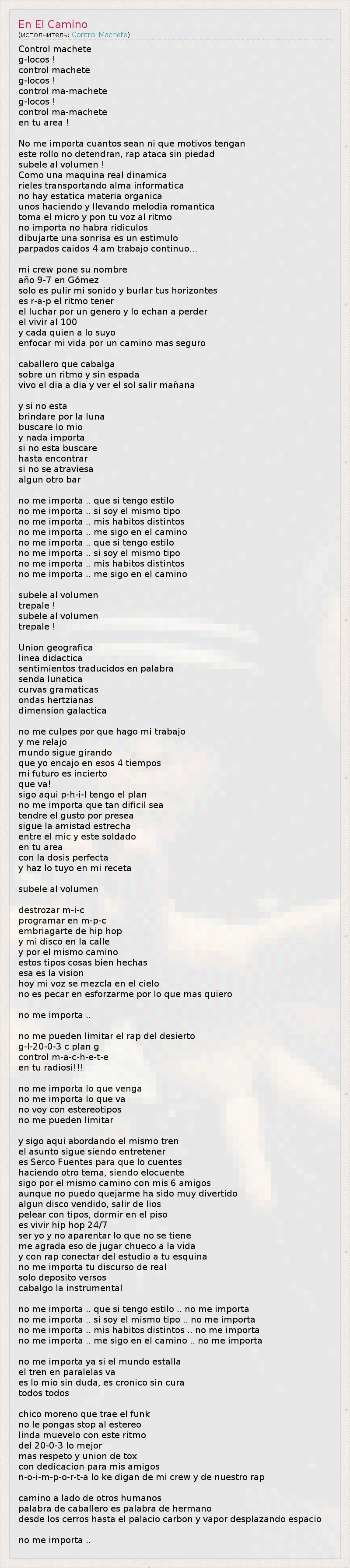 Control machete g-locos ! control machete g-locos ! control ma-machete g-locos ! control ma-machete en tu area ! No me importa cuantos sean ni que motivos tengan este rollo no detendran, rap ataca sin piedad subele al volumen ! Como una maquina real dinamica rieles transportando alma informatica no hay estatica materia organica unos haciendo y llevando melodia romantica toma el micro y pon tu voz al ritmo no importa no habra ridiculos dibujarte una sonrisa es un estimulo parpados caidos 4 am trabajo continuo… mi crew pone su nombre año 9-7 en Gómez solo es pulir mi sonido y burlar tus horizontes es r-a-p el ritmo tener el luchar por un genero y lo echan a perder el vivir al 100 y cada quien a lo suyo enfocar mi vida por un camino mas seguro caballero que cabalga sobre un ritmo y sin espada vivo el dia a dia y ver el sol salir mañana y si no esta brindare por la luna buscare lo mio y nada importa si no esta buscare hasta encontrar si no se atraviesa algun otro bar no me importa .. que si tengo estilo no me importa .. si soy el mismo tipo no me importa .. mis habitos distintos no me importa .. me sigo en el camino no me importa .. que si tengo estilo no me importa .. si soy el mismo tipo no me importa .. mis habitos distintos no me importa .. me sigo en el camino subele al volumen trepale ! subele al volumen trepale ! Union geografica linea didactica sentimientos traducidos en palabra senda lunatica curvas gramaticas ondas hertzianas dimension galactica no me culpes por que hago mi trabajo y me relajo mundo sigue girando que yo encajo en esos 4 tiempos mi futuro es incierto que va! sigo aqui p-h-i-l tengo el plan no me importa que tan dificil sea tendre el gusto por presea sigue la amistad estrecha entre el mic y este soldado en tu area con la dosis perfecta y haz lo tuyo en mi receta subele al volumen destrozar m-i-c programar en m-p-c embriagarte de hip hop y mi disco en la calle y por el mismo camino estos tipos cosas bien hechas esa es la vision hoy mi voz se mezcla en el cielo no es pecar en esforzarme por lo que mas quiero no me importa .. no me pueden limitar el rap del desierto g-l-20-0-3 c plan g control m-a-c-h-e-t-e en tu radiosi!!! no me importa lo que venga no me importa lo que va no voy con estereotipos no me pueden limitar y sigo aqui abordando el mismo tren el asunto sigue siendo entretener es Serco Fuentes para que lo cuentes haciendo otro tema, siendo elocuente sigo por el mismo camino con mis 6 amigos aunque no puedo quejarme ha sido muy divertido algun disco vendido, salir de lios pelear con tipos, dormir en el piso es vivir hip hop 24/7 ser yo y no aparentar lo que no se tiene me agrada eso de jugar chueco a la vida y con rap conectar del estudio a tu esquina no me importa tu discurso de real solo deposito versos cabalgo la instrumental no me importa .. que si tengo estilo .. no me importa no me importa .. si soy el mismo tipo .. no me importa no me importa .. mis habitos distintos .. no me importa no me importa .. me sigo en el camino .. no me importa no me importa ya si el mundo estalla el tren en paralelas va es lo mio sin duda, es cronico sin cura todos todos chico moreno que trae el funk no le pongas stop al estereo linda muevelo con este ritmo del 20-0-3 lo mejor mas respeto y union de tox con dedicacion para mis amigos n-o-i-m-p-o-r-t-a lo ke digan de mi crew y de nuestro rap camino a lado de otros humanos palabra de caballero es palabra de hermano desde los cerros hasta el palacio carbon y vapor desplazando espacio no me importa ..