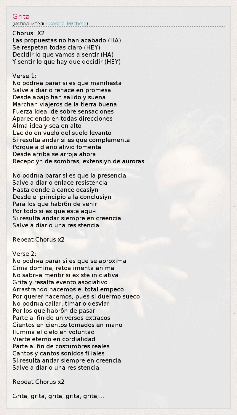 Chorus: X2 Las propuestas no han acabado (HA) Se respetan todas claro (HEY) Decidir lo que vamos a sentir (HA) Y sentir lo que hay que decidir (HEY) Verse 1: No podrнa parar si es que manifiesta Salve a diario renace en promesa Desde abajo han salido y suena Marchan viajeros de la tierra buena Fuerza ideal de sobre sensaciones Apareciendo en todas direcciones Alma idea y sea en alto Lъcido en vuelo del suelo levanto Si resulta andar si es que complementa Porque a diario alivio fomenta Desde arriba se arroja ahora Recepciуn de sombras, extensiуn de auroras No podrнa parar si es que la presencia Salve a diario enlace resistencia Hasta donde alcance ocasiуn Desde el principio a la conclusiуn Para los que habrбn de venir Por todo si es que esta aquн Si resulta andar siempre en creencia Salve a diario una resistencia Repeat Chorus x2 Verse 2: No podrнa parar si es que se aproxima Cima domina, retoalimenta anima No sabrнa mentir si existe iniciativa Grita y resalta evento asociativo Arrastrando hacemos el total empeсo Por querer hacemos, pues si duermo sueсo No podrнa callar, timar o desviar Por los que habrбn de pasar Parte al fin de universos extraсos Cientos en cientos tomados en mano Ilumina el cielo en voluntad Vierte eterno en cordialidad Parte al fin de costumbres reales Cantos y cantos sonidos filiales Si resulta andar siempre en creencia Salve a diario una resistencia Repeat Chorus x2 Grita, grita, grita, grita, grita,...