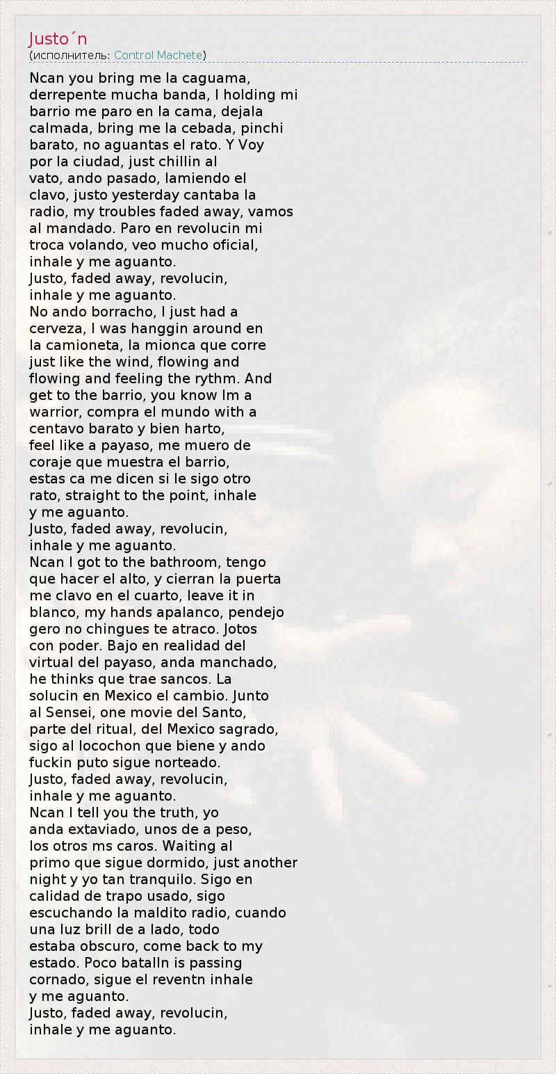 Ncan you bring me la caguama, derrepente mucha banda, I holding mi barrio me paro en la cama, dejala calmada, bring me la cebada, pinchi barato, no aguantas el rato. Y Voy por la ciudad, just chillin al vato, ando pasado, lamiendo el clavo, justo yesterday cantaba la radio, my troubles faded away, vamos al mandado. Paro en revolucin mi troca volando, veo mucho oficial, inhale y me aguanto. Justo, faded away, revolucin, inhale y me aguanto. No ando borracho, I just had a cerveza, I was hanggin around en la camioneta, la mionca que corre just like the wind, flowing and flowing and feeling the rythm. And get to the barrio, you know Im a warrior, compra el mundo with a centavo barato y bien harto, feel like a payaso, me muero de coraje que muestra el barrio, estas ca me dicen si le sigo otro rato, straight to the point, inhale y me aguanto. Justo, faded away, revolucin, inhale y me aguanto. Ncan I got to the bathroom, tengo que hacer el alto, y cierran la puerta me clavo en el cuarto, leave it in blanco, my hands apalanco, pendejo gero no chingues te atraco. Jotos con poder. Bajo en realidad del virtual del payaso, anda manchado, he thinks que trae sancos. La solucin en Mexico el cambio. Junto al Sensei, one movie del Santo, parte del ritual, del Mexico sagrado, sigo al locochon que biene y ando fuckin puto sigue norteado. Justo, faded away, revolucin, inhale y me aguanto. Ncan I tell you the truth, yo anda extaviado, unos de a peso, los otros ms caros. Waiting al primo que sigue dormido, just another night y yo tan tranquilo. Sigo en calidad de trapo usado, sigo escuchando la maldito radio, cuando una luz brill de a lado, todo estaba obscuro, come back to my estado. Poco batalln is passing cornado, sigue el reventn inhale y me aguanto. Justo, faded away, revolucin, inhale y me aguanto.