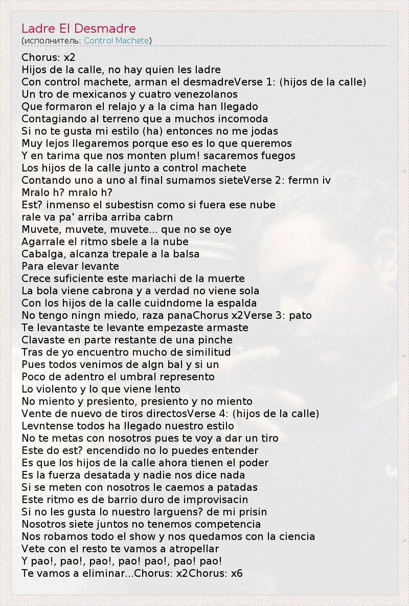 Chorus: x2 Hijos de la calle, no hay quien les ladre Con control machete, arman el desmadreVerse 1: (hijos de la calle) Un tro de mexicanos y cuatro venezolanos Que formaron el relajo y a la cima han llegado Contagiando al terreno que a muchos incomoda Si no te gusta mi estilo (ha) entonces no me jodas Muy lejos llegaremos porque eso es lo que queremos Y en tarima que nos monten plum! sacaremos fuegos Los hijos de la calle junto a control machete Contando uno a uno al final sumamos sieteVerse 2: fermn iv Mralo h? mralo h? Est? inmenso el subestisn como si fuera ese nube rale va pa' arriba arriba cabrn Muvete, muvete, muvete... que no se oye Agarrale el ritmo sbele a la nube Cabalga, alcanza trepale a la balsa Para elevar levante Crece suficiente este mariachi de la muerte La bola viene cabrona y a verdad no viene sola Con los hijos de la calle cuidndome la espalda No tengo ningn miedo, raza panaChorus x2Verse 3: pato Te levantaste te levante empezaste armaste Clavaste en parte restante de una pinche Tras de yo encuentro mucho de similitud Pues todos venimos de algn bal y si un Poco de adentro el umbral represento Lo violento y lo que viene lento No miento y presiento, presiento y no miento Vente de nuevo de tiros directosVerse 4: (hijos de la calle) Levntense todos ha llegado nuestro estilo No te metas con nosotros pues te voy a dar un tiro Este do est? encendido no lo puedes entender Es que los hijos de la calle ahora tienen el poder Es la fuerza desatada y nadie nos dice nada Si se meten con nosotros le caemos a patadas Este ritmo es de barrio duro de improvisacin Si no les gusta lo nuestro larguens? de mi prisin Nosotros siete juntos no tenemos competencia Nos robamos todo el show y nos quedamos con la ciencia Vete con el resto te vamos a atropellar Y pao!, pao!, pao!, pao! pao!, pao! pao! Te vamos a eliminar...Chorus: x2Chorus: x6