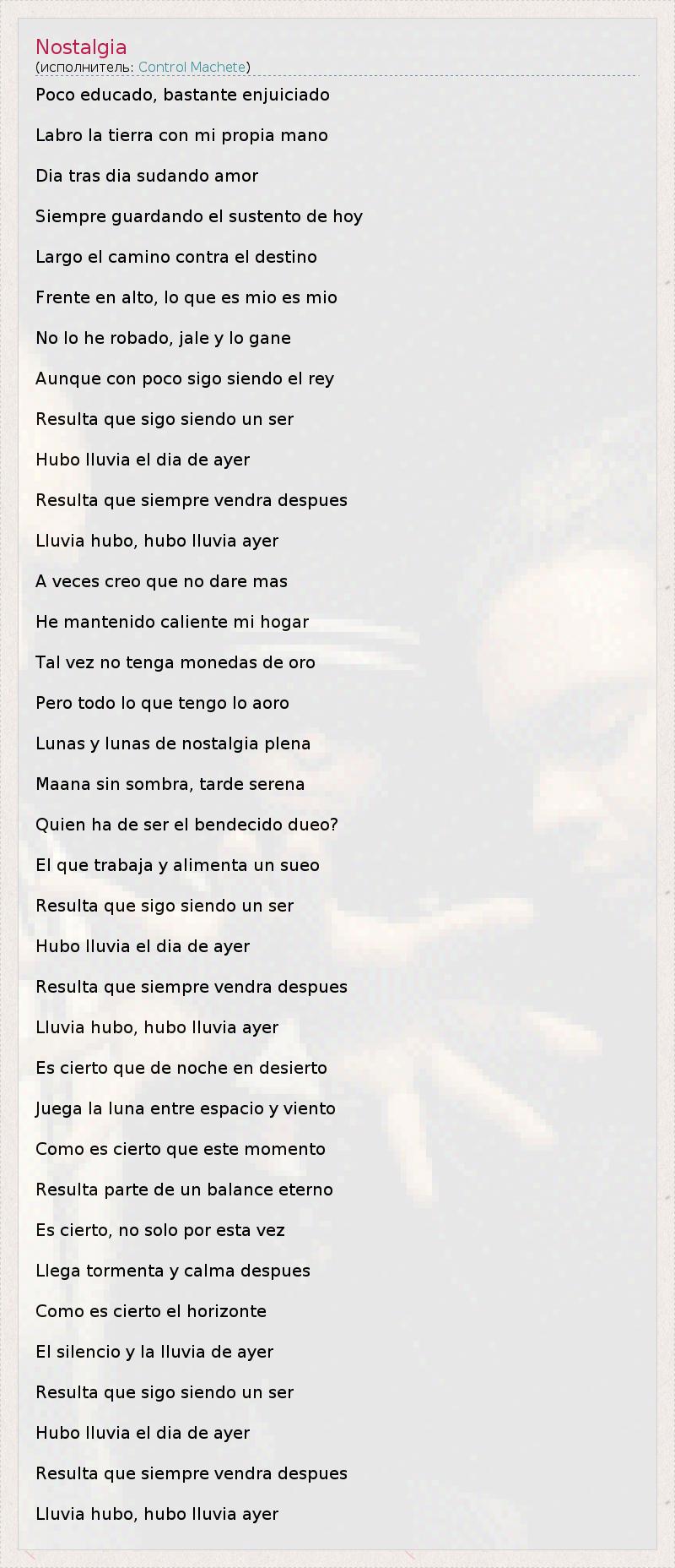 Poco educado, bastante enjuiciado Лабро ла Тьерра кон миль propia Мано Диаметр Tras диаметром sudando Amor Siempre эль guardando Sustento де хой Ларго El Camino противопоказания эль Destino Фронт ан-Альто, вот Que эс эс млн млн Нет вот он robado, джале у ло гане Aunque кон росо Sigo siendo эль-Рей Resulta Que Sigo siendo ООН сер Hubo Lluvia эль Диа-де-Айер Resulta Que Siempre vendra Despues Lluvia Hubo, Hubo Lluvia Айер VECES Creo Que не смел мас Он mantenido кальенте миль Hogar Таль не вез не TENGA Monedas-де-Оро Перо TODO вот Que Tengo вот aoro Лунас у Лунас де ностальгия Plena Maana грех Sombra, Тард Серена Квиен га-де-сер-эль bendecido dueo? Эль Que trabaja у Alimenta ООН sueo Resulta Que Sigo siendo ООН сер Hubo Lluvia эль Диа-де-Айер Resulta Que Siempre vendra Despues Lluvia Hubo, Hubo Lluvia Айер Эс cierto Que де ночь ан Desierto Juega La Luna Entre Espacio у Viento Комо эс cierto Que Эсте Momento Resulta одностороннем де снимите баланса Eterno Не Эс cierto, не соло POR Эста Чавес Llega Tormenta у Calma Despues Комо-эс-эль-Оризонти cierto Эль Silencio у ла Lluvia де Айер Resulta Que Sigo siendo ООН сер Hubo Lluvia эль Диа-де-Айер Resulta Que Siempre vendra Despues Lluvia Hubo, Hubo Lluvia Айер