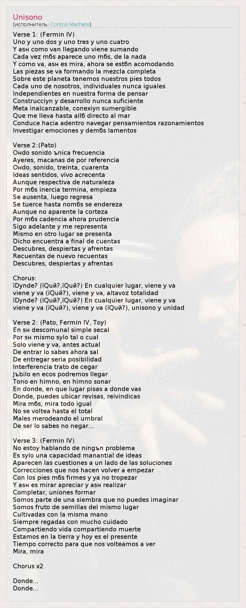 Verse 1: (Fermin IV) Uno y uno dos y uno tres y uno cuatro Y asн como van llegando viene sumando Cada vez mбs aparece uno mбs, de la nada Y como va, asн es mira, ahora se estбn acomodando Las piezas se va formando la mezcla completa Sobre este planeta tenemos nuestros pies todos Cada uno de nosotros, individuales nunca iguales Independientes en nuestra forma de pensar Construcciуn y desarrollo nunca suficiente Meta inalcanzable, conexiуn sumergible Que me lleva hasta allб directo al mar Conduce hacia adentro navegar pensamientos razonamientos Investigar emociones y demбs lamentos Verse 2:(Pato) Oнdo sonido ъnica frecuencia Ayeres, maсanas de por referencia Oнdo, sonido, treinta, cuarenta Ideas sentidos, vivo acrecenta Aunque respectiva de naturaleza Por mбs inercia termina, empieza Se ausenta, luego regresa Se tuerce hasta nomбs se endereza Aunque no aparente la corteza Por mбs cadencia ahora prudencia Sigo adelante y me representa Mismo en otro lugar se presenta Dicho encuentra a final de cuentas Descubres, despiertas y afrentas Recuentas de nuevo recuentas Descubres, despiertas y afrentas Chorus: їDуnde? (їQuй?,їQuй?) En cualquier lugar, viene y va viene y va (їQuй?), viene y va, altavoz totalidad їDуnde? (їQuй?,їQuй?) En cualquier lugar, viene y va viene y va (їQuй?), viene y va (їQuй?), unisono y unidad Verse 2: (Pato, Fermin IV, Toy) En sн descomunal simple seсal Por sн mismo sуlo tal o cual Solo viene y va, antes actual De entrar lo sabes ahora sal De entregar seria posibilidad Interferencia trato de cegar Jъbilo en ecos podremos llegar Tono en himno, en himno sonar En donde, en que lugar pisas a donde vas Donde, puedes ubicar revisas, reivindicas Mira mбs, mira todo igual No se voltea hasta el total Males merodeando el umbral De ser lo sabes no negar... Verse 3: (Fermin IV) No estoy hablando de ningъn problema Es sуlo una capacidad manantial de ideas Aparecen las cuestiones a un lado de las soluciones Correcciones que nos hacen volver a empezar Con los pies mбs firmes y ya no tropezar Y asн es mirar apreciar y asн realizar Completar, uniones formar Somos parte de una siembra que no puedes imaginar Somos fruto de semillas del mismo lugar Cultivadas con la misma mano Siempre regadas con mucho cuidado Compartiendo vida compartiendo muerte Estamos en la tierra y hoy es el presente Tiempo correcto para que nos volteamos a ver Mira, mira Chorus x2 Donde... Donde...