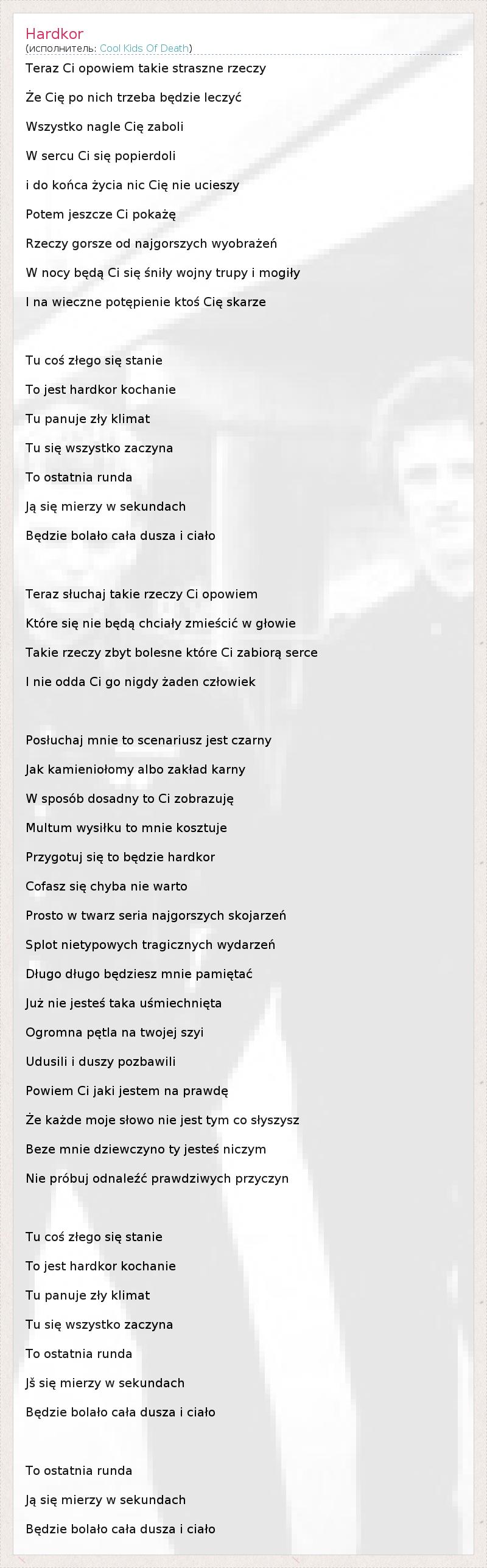 Teraz Ci opowiem takie straszne rzeczy Że Cię po nich trzeba będzie leczyć Wszystko nagle Cię zaboli W sercu Ci się popierdoli i do końca życia nic Cię nie ucieszy Potem jeszcze Ci pokażę Rzeczy gorsze od najgorszych wyobrażeń W nocy będą Ci się śniły wojny trupy i mogiły I na wieczne potępienie ktoś Cię skarze Tu coś złego się stanie To jest hardkor kochanie Tu panuje zły klimat Tu się wszystko zaczyna To ostatnia runda Ją się mierzy w sekundach Będzie bolało cała dusza i ciało Teraz słuchaj takie rzeczy Ci opowiem Które się nie będą chciały zmieścić w głowie Takie rzeczy zbyt bolesne które Ci zabiorą serce I nie odda Ci go nigdy żaden człowiek Posłuchaj mnie to scenariusz jest czarny Jak kamieniołomy albo zakład karny W sposób dosadny to Ci zobrazuję Multum wysiłku to mnie kosztuje Przygotuj się to będzie hardkor Cofasz się chyba nie warto Prosto w twarz seria najgorszych skojarzeń Splot nietypowych tragicznych wydarzeń Długo długo będziesz mnie pamiętać Już nie jesteś taka uśmiechnięta Ogromna pętla na twojej szyi Udusili i duszy pozbawili Powiem Ci jaki jestem na prawdę Że każde moje słowo nie jest tym co słyszysz Beze mnie dziewczyno ty jesteś niczym Nie próbuj odnaleźć prawdziwych przyczyn Tu coś złego się stanie To jest hardkor kochanie Tu panuje zły klimat Tu się wszystko zaczyna To ostatnia runda Jš się mierzy w sekundach Będzie bolało cała dusza i ciało To ostatnia runda Ją się mierzy w sekundach Będzie bolało cała dusza i ciało