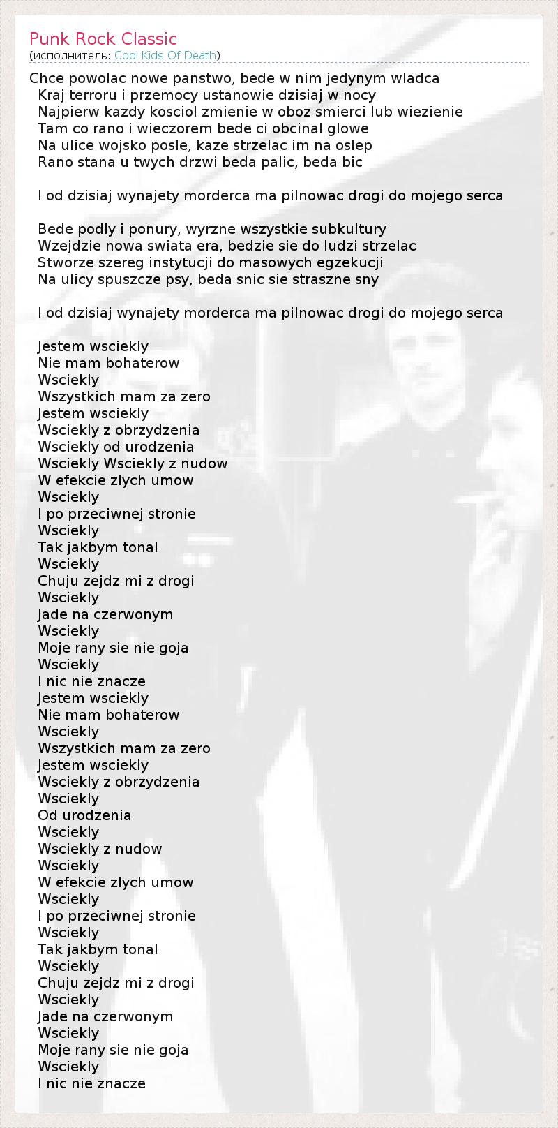 Chce powolac nowe panstwo, bede w nim jedynym wladca Kraj terroru i przemocy ustanowie dzisiaj w nocy Najpierw kazdy kosciol zmienie w oboz smierci lub wiezienie Tam co rano i wieczorem bede ci obcinal glowe Na ulice wojsko posle, kaze strzelac im na oslep Rano stana u twych drzwi beda palic, beda bic I od dzisiaj wynajety morderca ma pilnowac drogi do mojego serca Bede podly i ponury, wyrzne wszystkie subkultury Wzejdzie nowa swiata era, bedzie sie do ludzi strzelac Stworze szereg instytucji do masowych egzekucji Na ulicy spuszcze psy, beda snic sie straszne sny I od dzisiaj wynajety morderca ma pilnowac drogi do mojego serca Jestem wsciekly Nie mam bohaterow Wsciekly Wszystkich mam za zero Jestem wsciekly Wsciekly z obrzydzenia Wsciekly od urodzenia Wsciekly Wsciekly z nudow W efekcie zlych umow Wsciekly I po przeciwnej stronie Wsciekly Tak jakbym tonal Wsciekly Chuju zejdz mi z drogi Wsciekly Jade na czerwonym Wsciekly Moje rany sie nie goja Wsciekly I nic nie znacze Jestem wsciekly Nie mam bohaterow Wsciekly Wszystkich mam za zero Jestem wsciekly Wsciekly z obrzydzenia Wsciekly Od urodzenia Wsciekly Wsciekly z nudow Wsciekly W efekcie zlych umow Wsciekly I po przeciwnej stronie Wsciekly Tak jakbym tonal Wsciekly Chuju zejdz mi z drogi Wsciekly Jade na czerwonym Wsciekly Moje rany sie nie goja Wsciekly I nic nie znacze
