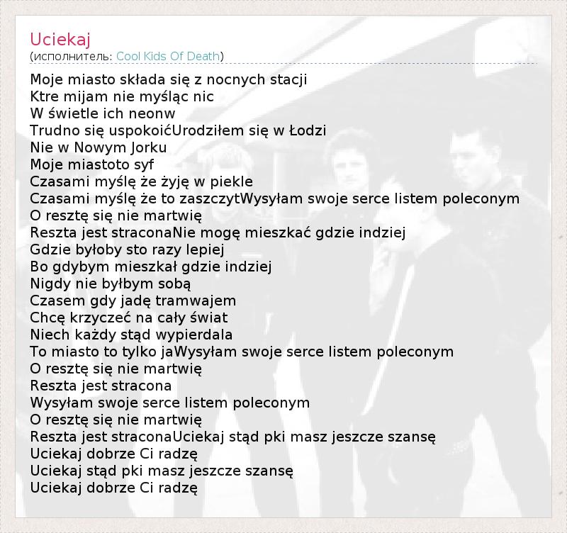 Moje miasto składa się z nocnych stacji Ktre mijam nie myśląc nic W świetle ich neonw Trudno się uspokoićUrodziłem się w Łodzi Nie w Nowym Jorku Moje miastoto syf Czasami myślę że żyję w piekle Czasami myślę że to zaszczytWysyłam swoje serce listem poleconym O resztę się nie martwię Reszta jest straconaNie mogę mieszkać gdzie indziej Gdzie byłoby sto razy lepiej Bo gdybym mieszkał gdzie indziej Nigdy nie byłbym sobą Czasem gdy jadę tramwajem Chcę krzyczeć na cały świat Niech każdy stąd wypierdala To miasto to tylko jaWysyłam swoje serce listem poleconym O resztę się nie martwię Reszta jest stracona Wysyłam swoje serce listem poleconym O resztę się nie martwię Reszta jest straconaUciekaj stąd pki masz jeszcze szansę Uciekaj dobrze Ci radzę Uciekaj stąd pki masz jeszcze szansę Uciekaj dobrze Ci radzę