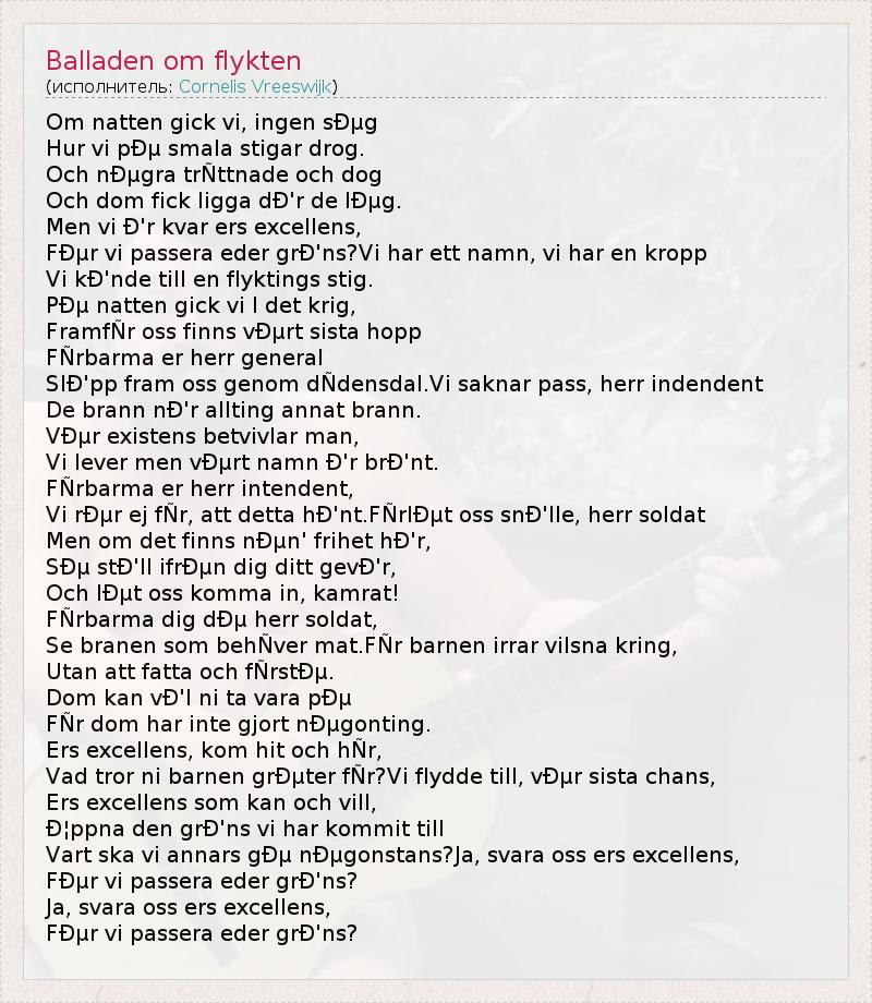 Om natten gick vi, ingen sеg Hur vi pе smala stigar drog. Och nеgra trÑttnade och dog Och dom fick ligga dÐ'r de lеg. Men vi Ð'r kvar ers excellens, Fеr vi passera eder grÐ'ns?Vi har ett namn, vi har en kropp Vi kÐ'nde till en flyktings stig. Pе natten gick vi I det krig, FramfÑr oss finns vеrt sista hopp FÑrbarma er herr general SlÐ'pp fram oss genom dÑdensdal.Vi saknar pass, herr indendent De brann nÐ'r allting annat brann. Vеr existens betvivlar man, Vi lever men vеrt namn Ð'r brÐ'nt. FÑrbarma er herr intendent, Vi rеr ej fÑr, att detta hÐ'nt.FÑrlеt oss snÐ'lle, herr soldat Men om det finns nеn' frihet hÐ'r, Sе stÐ'll ifrеn dig ditt gevÐ'r, Och lеt oss komma in, kamrat! FÑrbarma dig dе herr soldat, Se branen som behÑver mat.FÑr barnen irrar vilsna kring, Utan att fatta och fÑrstе. Dom kan vÐ'l ni ta vara pе FÑr dom har inte gjort nеgonting. Ers excellens, kom hit och hÑr, Vad tror ni barnen grеter fÑr?Vi flydde till, vеr sista chans, Ers excellens som kan och vill, Цppna den grÐ'ns vi har kommit till Vart ska vi annars gе nеgonstans?Ja, svara oss ers excellens, Fеr vi passera eder grÐ'ns? Ja, svara oss ers excellens, Fеr vi passera eder grÐ'ns?