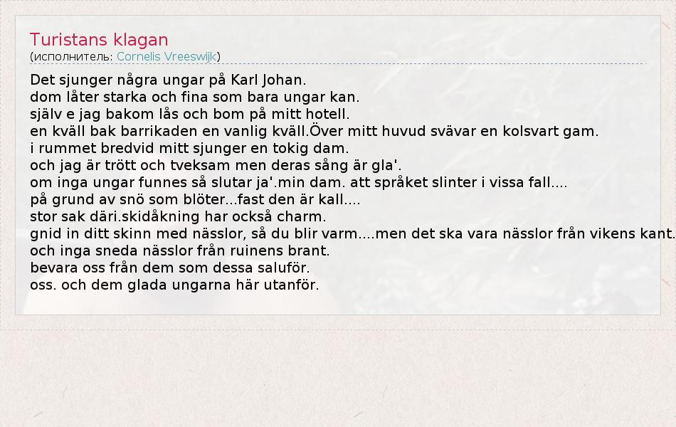 А как ты думаешь, о чем песня "Turistans klagan" ?