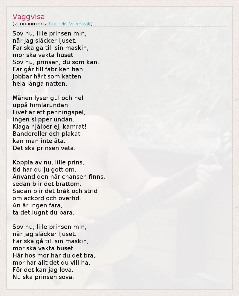 Sov nu, lille prinsen min, när jag släcker ljuset. Far ska gå till sin maskin, mor ska vakta huset. Sov nu, prinsen, du som kan. Far går till fabriken han. Jobbar hårt som katten hela långa natten. Månen lyser gul och hel uppå himlarundan. Livet är ett penningspel, ingen slipper undan. Klaga hjälper ej, kamrat! Banderoller och plakat kan man inte äta. Det ska prinsen veta. Koppla av nu, lille prins, tid har du ju gott om. Använd den när chansen finns, sedan blir det bråttom. Sedan blir det bråk och strid om ackord och övertid. Än är ingen fara, ta det lugnt du bara. Sov nu, lille prinsen min, när jag släcker ljuset. Far ska gå till sin maskin, mor ska vakta huset. Här hos mor har du det bra, mor har allt det du vill ha. För det kan jag lova. Nu ska prinsen sova.