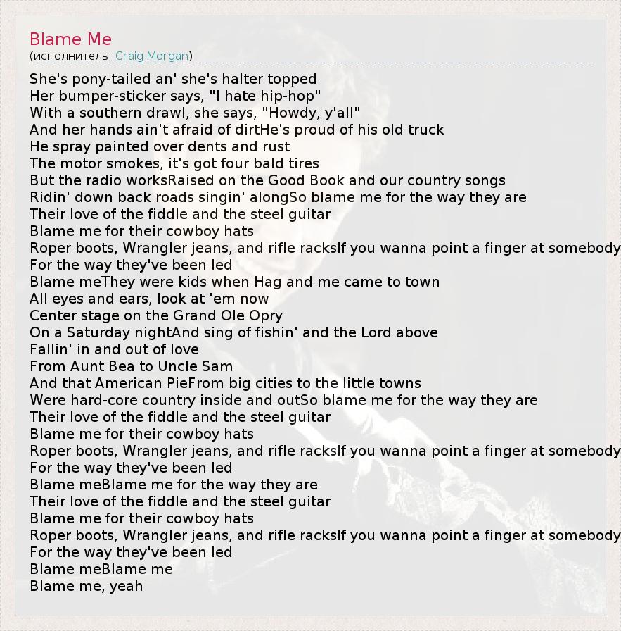 She's pony-tailed an' she's halter topped Her bumper-sticker says, "I hate hip-hop" With a southern drawl, she says, "Howdy, y'all" And her hands ain't afraid of dirtHe's proud of his old truck He spray painted over dents and rust The motor smokes, it's got four bald tires But the radio worksRaised on the Good Book and our country songs Ridin' down back roads singin' alongSo blame me for the way they are Their love of the fiddle and the steel guitar Blame me for their cowboy hats Roper boots, Wrangler jeans, and rifle racksIf you wanna point a finger at somebody For the way they've been led Blame meThey were kids when Hag and me came to town All eyes and ears, look at 'em now Center stage on the Grand Ole Opry On a Saturday nightAnd sing of fishin' and the Lord above Fallin' in and out of love From Aunt Bea to Uncle Sam And that American PieFrom big cities to the little towns Were hard-core country inside and outSo blame me for the way they are Their love of the fiddle and the steel guitar Blame me for their cowboy hats Roper boots, Wrangler jeans, and rifle racksIf you wanna point a finger at somebody For the way they've been led Blame meBlame me for the way they are Their love of the fiddle and the steel guitar Blame me for their cowboy hats Roper boots, Wrangler jeans, and rifle racksIf you wanna point a finger at somebody For the way they've been led Blame meBlame me Blame me, yeah