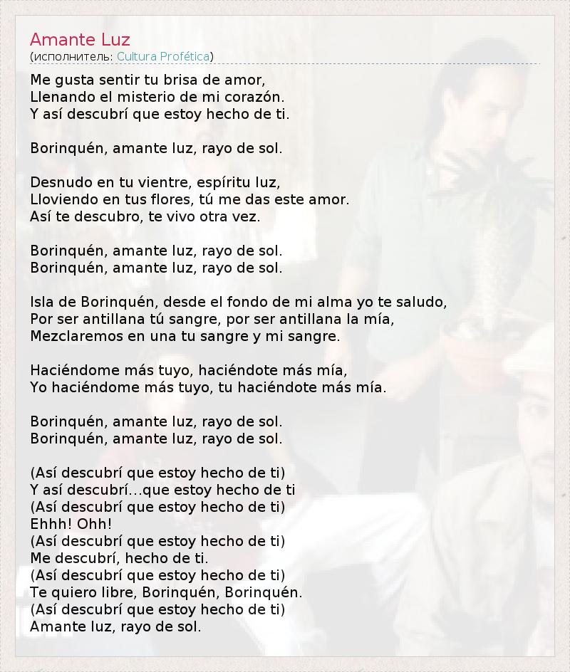 Мне нравится чувствовать дыхание любви, Заполнение тайну моего сердца. И поэтому я обнаружил, что я сделал вам. Borinquen, любящего света, солнечный луч. Голые в чреве, свет духа, Дождь на ваших цветов, вы даете мне эту любовь. Так я открываю, я снова жить. Borinquen, любящего света, солнечный луч. Borinquen, любящего света, солнечный луч. Остров Borinquen, из глубины моей души я приветствую вас, Потому что вы Антильские крови, будучи Антильских шахте, Смешайте в крови и моей крови. Создание мне твое, что делает его более шахту, Я сделал меня твоим, ваш делать вам больше моей. Borinquen, любящего света, солнечный луч. Borinquen, любящего света, солнечный луч. (Так я обнаружил, что я сделал с вами) И поэтому я обнаружил ... Я сделал с вами (Так я обнаружил, что я сделал с вами) Эххх! Ооо! (Так я обнаружил, что я сделал с вами) Я обнаружил, сделал из вас. (Так я обнаружил, что я сделал с вами) Я люблю бесплатно, Borinquen, Borinquen. (Так я обнаружил, что я сделал с вами) Любить свет, солнечный луч.