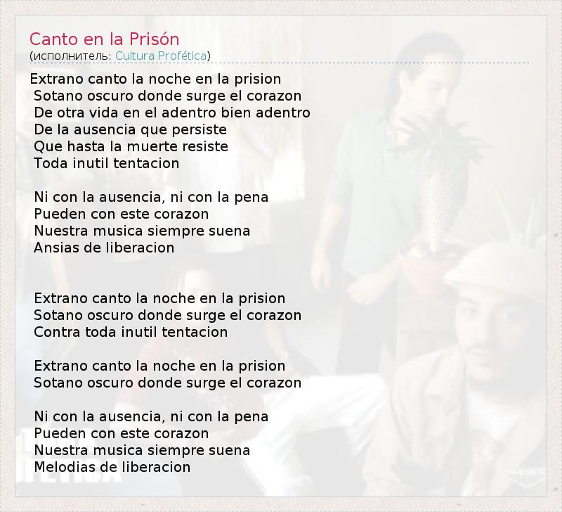Extrano canto la noche en la prision Sotano oscuro donde surge el corazon De otra vida en el adentro bien adentro De la ausencia que persiste Que hasta la muerte resiste Toda inutil tentacion Ni con la ausencia, ni con la pena Pueden con este corazon Nuestra musica siempre suena Ansias de liberacion Extrano canto la noche en la prision Sotano oscuro donde surge el corazon Contra toda inutil tentacion Extrano canto la noche en la prision Sotano oscuro donde surge el corazon Ni con la ausencia, ni con la pena Pueden con este corazon Nuestra musica siempre suena Melodias de liberacion