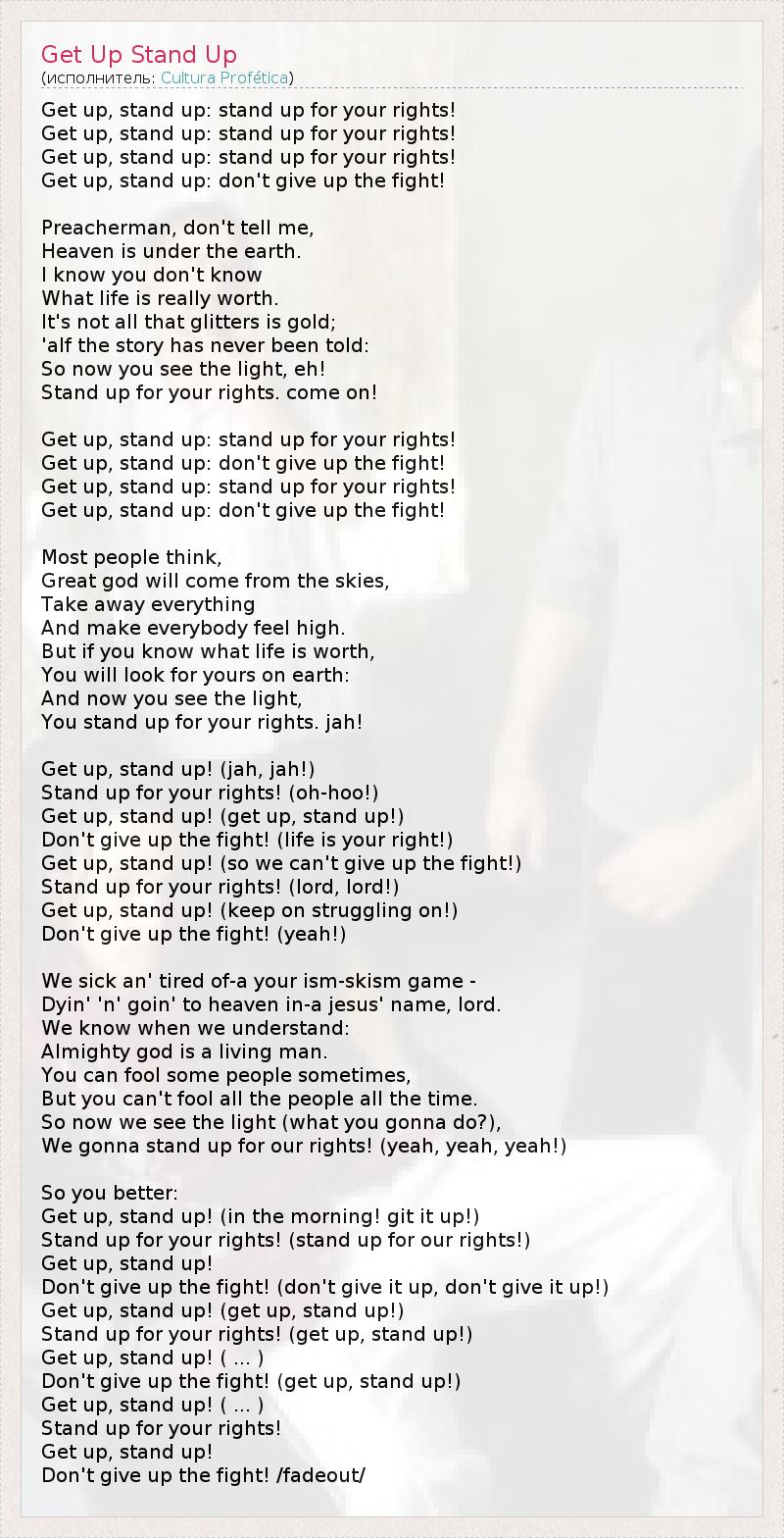 Поднимайся, вставай. Вставай за свои права Поднимайся, вставай. Вставай за свои права Поднимайся, вставай. Вставай за свои права Поднимайся, вставай. Вставай за свои права Проповедник не сказал мне Что небеса под землей. Я знаю что ты не знаешь Чего жизнь на самом деле стоит Не все то золото, что блестит Половина истории никогда не была рассказана Теперь ты видишь свет, эх! Встань за свои права. Поднимайся, вставай. Вставай за свои права Поднимайся, вставай. Вставай за свои права Поднимайся, вставай. Вставай за свои права Поднимайся, вставай. Вставай за свои права Многие люди думают Что великий бог придет с небес Все уберет И сделает всех счастливыми Но если ты знаешь чего стоит жизнь Ты будешь искать себя на земле Теперь ты видишь свет Встань за свои права. Поднимайся, вставай Вставай за свои права Не сдавайся в борьбе! Поднимайся, вставай Вставай за свои права Поднимайся, вставай Не сдавайся в борьбе! Мы больны и уставши от твоей игры, которая делит людей. Умирая и уходя на небеса во имя иисуса Мы знаем, когда мы поняли Что великий бог – живой человек Ты можешь иногда кого-то обдурить Но ты не можешь дурить всех и всегда. Теперь мы видим свет (что ты будешь делать?) Мы собираемся встать за свои права Поднимайся, вставай Вставай за свои права Не сдавайся в борьбе! Поднимайся, вставай Вставай за свои права Поднимайся, вставай Не сдавайся в борьбе!