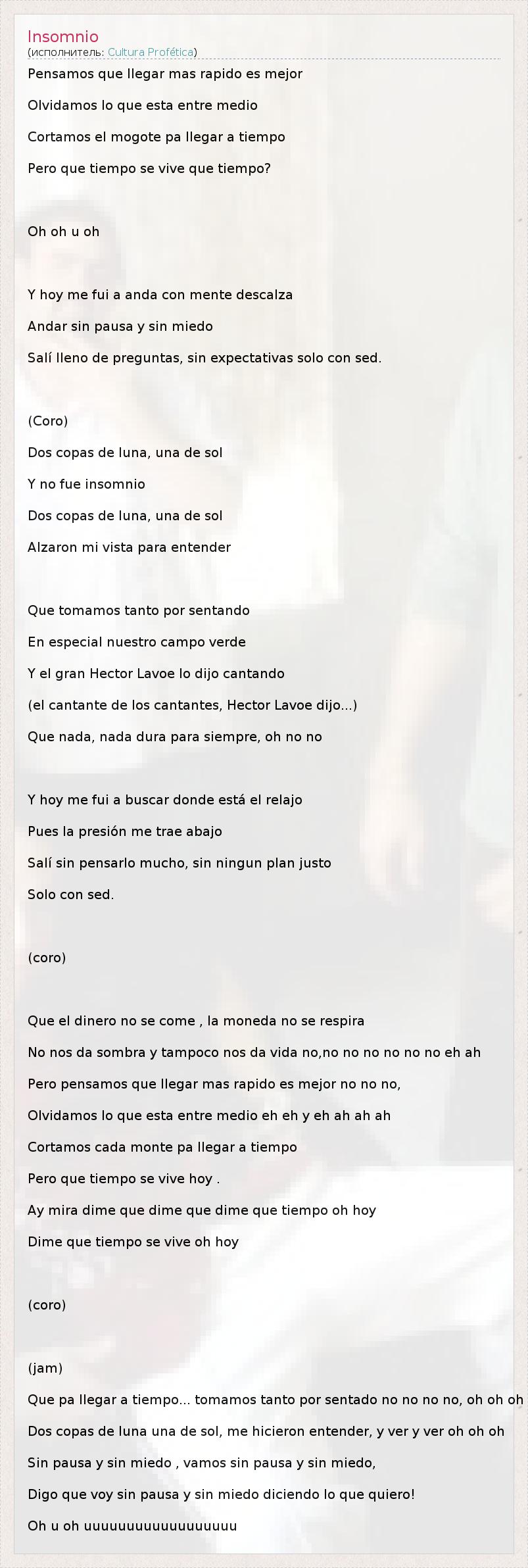 Pensamos que llegar mas rapido es mejor Olvidamos lo que esta entre medio Cortamos el mogote pa llegar a tiempo Pero que tiempo se vive que tiempo? Oh oh u oh Y hoy me fui a anda con mente descalza Andar sin pausa y sin miedo Salí lleno de preguntas, sin expectativas solo con sed. (Coro) Dos copas de luna, una de sol Y no fue insomnio Dos copas de luna, una de sol Alzaron mi vista para entender Que tomamos tanto por sentando En especial nuestro campo verde Y el gran Hector Lavoe lo dijo cantando (el cantante de los cantantes, Hector Lavoe dijo...) Que nada, nada dura para siempre, oh no no Y hoy me fui a buscar donde está el relajo Pues la presión me trae abajo Salí sin pensarlo mucho, sin ningun plan justo Solo con sed. (coro) Que el dinero no se come , la moneda no se respira No nos da sombra y tampoco nos da vida no,no no no no no no eh ah Pero pensamos que llegar mas rapido es mejor no no no, Olvidamos lo que esta entre medio eh eh y eh ah ah ah Cortamos cada monte pa llegar a tiempo Pero que tiempo se vive hoy . Ay mira dime que dime que dime que tiempo oh hoy Dime que tiempo se vive oh hoy (coro) (jam) Que pa llegar a tiempo... tomamos tanto por sentado no no no no, oh oh oh Dos copas de luna una de sol, me hicieron entender, y ver y ver oh oh oh Sin pausa y sin miedo , vamos sin pausa y sin miedo, Digo que voy sin pausa y sin miedo diciendo lo que quiero! Oh u oh uuuuuuuuuuuuuuuuuu