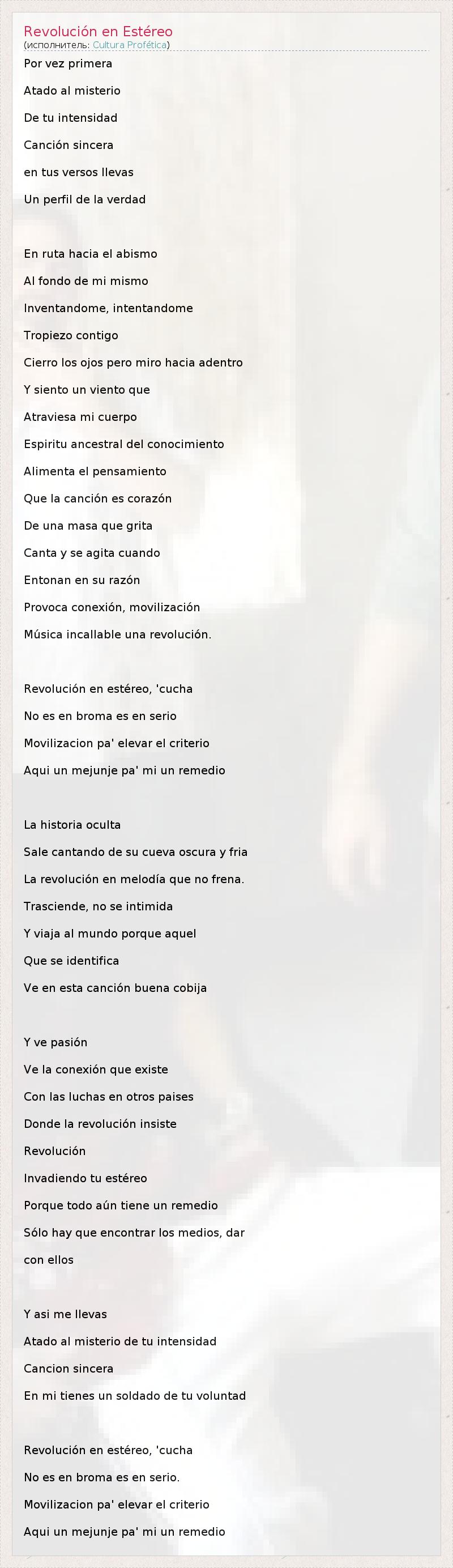 Por vez primera Atado al misterio De tu intensidad Canción sincera en tus versos llevas Un perfil de la verdad En ruta hacia el abismo Al fondo de mi mismo Inventandome, intentandome Tropiezo contigo Cierro los ojos pero miro hacia adentro Y siento un viento que Atraviesa mi cuerpo Espiritu ancestral del conocimiento Alimenta el pensamiento Que la canción es corazón De una masa que grita Canta y se agita cuando Entonan en su razón Provoca conexión, movilización Música incallable una revolución. Revolución en estéreo, 'cucha No es en broma es en serio Movilizacion pa' elevar el criterio Aqui un mejunje pa' mi un remedio La historia oculta Sale cantando de su cueva oscura y fria La revolución en melodía que no frena. Trasciende, no se intimida Y viaja al mundo porque aquel Que se identifica Ve en esta canción buena cobija Y ve pasión Ve la conexión que existe Con las luchas en otros paises Donde la revolución insiste Revolución Invadiendo tu estéreo Porque todo aún tiene un remedio Sólo hay que encontrar los medios, dar con ellos Y asi me llevas Atado al misterio de tu intensidad Cancion sincera En mi tienes un soldado de tu voluntad Revolución en estéreo, 'cucha No es en broma es en serio. Movilizacion pa' elevar el criterio Aqui un mejunje pa' mi un remedio