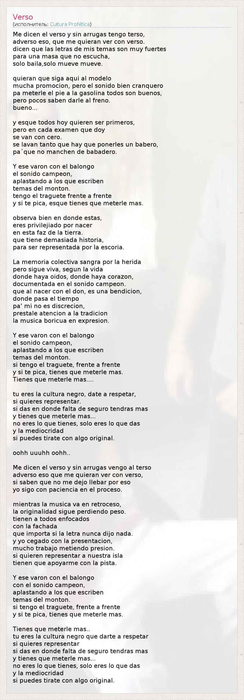 Они говорят, что стих без морщин приходят гладкой, неблагоприятные почему я хочу сделать со стихом. Они говорят, что текст моих песен очень сильны для масса не слушать, просто танцевать, просто двигаться ходы. здесь хотят продолжать моделировать много продвижения, но хороший звук cranquero годовых придерживаться мою ногу на бензин они все хорошо, но мало кто знает его тормозить. хорошо ... эск и сегодня все хотят быть первыми, но каждый тест, который я они идут к нулю. в то время как там мыть их под нагрудник, Не Pa'que не окрашивание подвеса. И, что человек с Balongo Чемпион звук, дробления письма Темы много. У меня есть traguete видом и если вы погружаетесь, вы должны поставить ему больше эск. Посмотрите внимательно, где вы находитесь, Вы родились privilejiado в земле. она имеет слишком много истории, должен быть представлен в шлаке. Коллективная память кровотечение из раны но все еще жив, по жизни где есть уши, там, где есть сердце, документально в звуке чемпиона. при рождении с подарком, это благословение, где проходит время годовых 'ми не усмотрению, Обратите внимание на традиции Пуэрто-Рико музыка в выражении. И, что человек с Balongo Чемпион звук, дробления письма Темы много. если у меня есть traguete, лицом к лицу и если вы погружаетесь, вы должны поставить его больше. Вы должны поставить его более .... ты черная культура, дата уважать, если вы хотите, чтобы представлять. если вы даете, где отсутствие страхования будет больше и вы должны положить ему больше ... Вы не то, что у вас есть, вы просто, что вы даете и посредственность если вы можете бросить себя что-то оригинальное. уу-уух, оо, оо .. Они говорят, что стих без морщин прийти к гладкой неблагоприятное, что они хотят, чтобы я сделал со стихом, если не дайте мне знать, почему llebar Я до сих пор есть терпение в процессе. В то время как музыка идет в обратном направлении, Оригинальность по-прежнему теряет вес. уже все сосредоточены с фасада Будь письме, что никогда ничего не говорил. и ослеплен с представлением, положить много давления работы. если они хотят, чтобы представлять наш остров Они должны опираться с трассой. И, что человек с Balongo с звуковым чемпиона, дробления письма Темы много. если у меня есть traguete, лицом к лицу и если вы погружаетесь, вы должны поставить его больше. Вы должны поставить ему более .. Вы черную культуру, дать уважать если вы хотите, чтобы представлять если вы даете, где отсутствие страхования будет больше и вы должны положить ему больше ... Вы не то, что у вас есть, вы просто, что вы даете и посредственность если вы можете бросить себя что-то оригинальное.