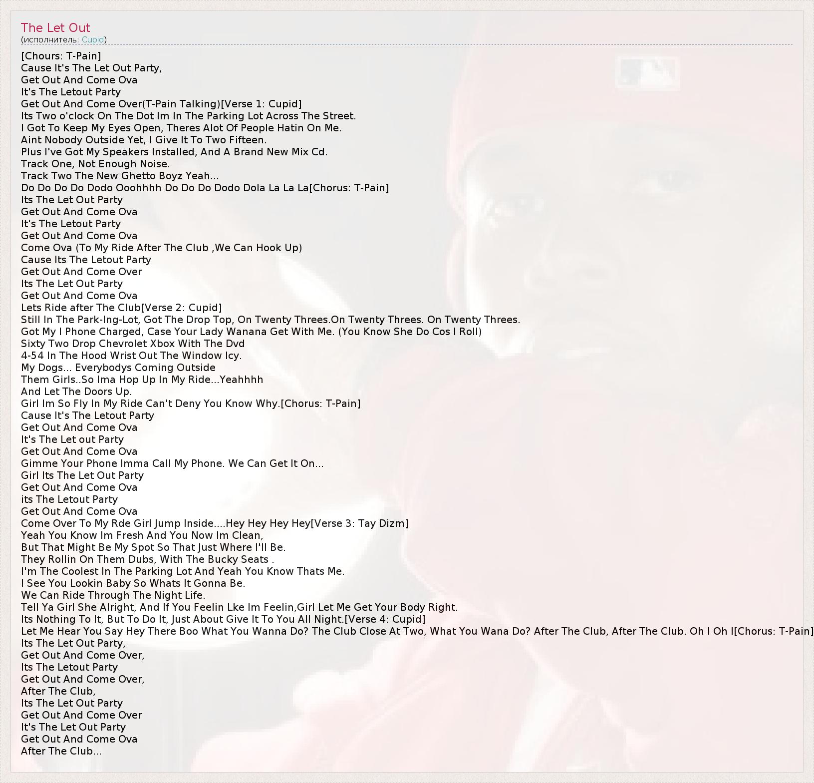 [Chours: T-Pain] Cause It's The Let Out Party, Get Out And Come Ova It's The Letout Party Get Out And Come Over(T-Pain Talking)[Verse 1: Cupid] Its Two o'clock On The Dot Im In The Parking Lot Across The Street. I Got To Keep My Eyes Open, Theres Alot Of People Hatin On Me. Aint Nobody Outside Yet, I Give It To Two Fifteen. Plus I've Got My Speakers Installed, And A Brand New Mix Cd. Track One, Not Enough Noise. Track Two The New Ghetto Boyz Yeah... Do Do Do Do Dodo Ooohhhh Do Do Do Dodo Dola La La La[Chorus: T-Pain] Its The Let Out Party Get Out And Come Ova It's The Letout Party Get Out And Come Ova Come Ova (To My Ride After The Club ,We Can Hook Up) Cause Its The Letout Party Get Out And Come Over Its The Let Out Party Get Out And Come Ova Lets Ride after The Club[Verse 2: Cupid] Still In The Park-Ing-Lot, Got The Drop Top, On Twenty Threes.On Twenty Threes. On Twenty Threes. Got My I Phone Charged, Case Your Lady Wanana Get With Me. (You Know She Do Cos I Roll) Sixty Two Drop Chevrolet Xbox With The Dvd 4-54 In The Hood Wrist Out The Window Icy. My Dogs... Everybodys Coming Outside Them Girls..So Ima Hop Up In My Ride...Yeahhhh And Let The Doors Up. Girl Im So Fly In My Ride Can't Deny You Know Why.[Chorus: T-Pain] Cause It's The Letout Party Get Out And Come Ova It's The Let out Party Get Out And Come Ova Gimme Your Phone Imma Call My Phone. We Can Get It On... Girl Its The Let Out Party Get Out And Come Ova its The Letout Party Get Out And Come Ova Come Over To My Rde Girl Jump Inside....Hey Hey Hey Hey[Verse 3: Tay Dizm] Yeah You Know Im Fresh And You Now Im Clean, But That Might Be My Spot So That Just Where I'll Be. They Rollin On Them Dubs, With The Bucky Seats . I'm The Coolest In The Parking Lot And Yeah You Know Thats Me. I See You Lookin Baby So Whats It Gonna Be. We Can Ride Through The Night Life. Tell Ya Girl She Alright, And If You Feelin Lke Im Feelin,Girl Let Me Get Your Body Right. Its Nothing To It, But To Do It, Just About Give It To You All Night.[Verse 4: Cupid] Let Me Hear You Say Hey There Boo What You Wanna Do? The Club Close At Two, What You Wana Do? After The Club, After The Club. Oh I Oh I[Chorus: T-Pain] Its The Let Out Party, Get Out And Come Over, Its The Letout Party Get Out And Come Over, After The Club, Its The Let Out Party Get Out And Come Over It's The Let Out Party Get Out And Come Ova After The Club...