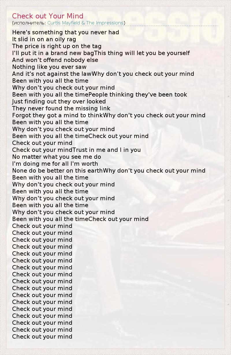 Here's something that you never had It slid in on an oily rag The price is right up on the tag I'll put it in a brand new bagThis thing will let you be yourself And won't offend nobody else Nothing like you ever saw And it's not against the lawWhy don't you check out your mind Been with you all the time Why don't you check out your mind Been with you all the timePeople thinking they've been took Just finding out they over looked They never found the missing link Forgot they got a mind to thinkWhy don't you check out your mind Been with you all the time Why don't you check out your mind Been with you all the timeCheck out your mind Check out your mind Check out your mindTrust in me and I in you No matter what you see me do I'm doing me for all I'm worth None do be better on this earthWhy don't you check out your mind Been with you all the time Why don't you check out your mind Been with you all the time Why don't you check out your mind Been with you all the time Why don't you check out your mind Been with you all the timeCheck out your mind Check out your mind Check out your mind Check out your mind Check out your mind Check out your mind Check out your mind Check out your mind Check out your mind Check out your mind Check out your mind Check out your mind Check out your mind Check out your mind Check out your mind Check out your mind Check out your mind Check out your mind