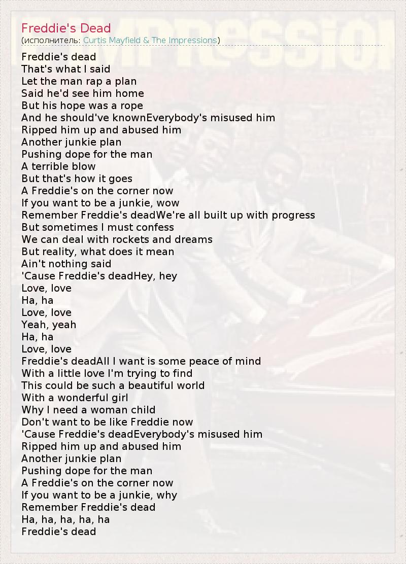 Freddie's dead That's what I said Let the man rap a plan Said he'd see him home But his hope was a rope And he should've knownEverybody's misused him Ripped him up and abused him Another junkie plan Pushing dope for the man A terrible blow But that's how it goes A Freddie's on the corner now If you want to be a junkie, wow Remember Freddie's deadWe're all built up with progress But sometimes I must confess We can deal with rockets and dreams But reality, what does it mean Ain't nothing said 'Cause Freddie's deadHey, hey Love, love Ha, ha Love, love Yeah, yeah Ha, ha Love, love Freddie's deadAll I want is some peace of mind With a little love I'm trying to find This could be such a beautiful world With a wonderful girl Why I need a woman child Don't want to be like Freddie now 'Cause Freddie's deadEverybody's misused him Ripped him up and abused him Another junkie plan Pushing dope for the man A Freddie's on the corner now If you want to be a junkie, why Remember Freddie's dead Ha, ha, ha, ha, ha Freddie's dead