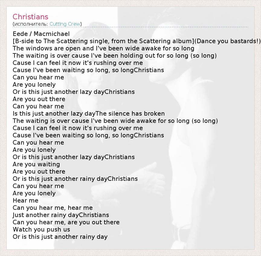 Eede / Macmichael [B-side to The Scattering single, from the Scattering album](Dance you bastards!) The windows are open and I've been wide awake for so long The waiting is over cause I've been holding out for so long (so long) Cause I can feel it now it's rushing over me Cause I've been waiting so long, so longChristians Can you hear me Are you lonely Or is this just another lazy dayChristians Are you out there Can you hear me Is this just another lazy dayThe silence has broken The waiting is over cause I've been wide awake for so long (so long) Cause I can feel it now it's rushing over me Cause I've been waiting so long, so longChristians Can you hear me Are you lonely Or is this just another lazy dayChristians Are you waiting Are you out there Or is this just another rainy dayChristians Can you hear me Are you lonely Hear me Can you hear me, hear me Just another rainy dayChristians Can you hear me, are you out there Watch you push us Or is this just another rainy day