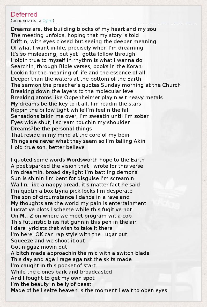Dreams are, the building blocks of my heart and my soul The meeting unfolds, hoping that my story is told Driftin, with eyes closed but seeing the deeper meaning Of what I want in life, precisely when I'm dreaming It's so misleading, but yet I gotta follow through Holdin true to myself in rhythm is what I wanna do Searchin, through Bible verses, books in the Koran Lookin for the meaning of life and the essence of all Deeper than the waters at the bottom of the Earth The sermon the preacher's quotes Sunday morning at the Church Breaking down the layers to the molecular level Breaking atoms like Oppenheimer playin wit heavy metals My dreams be the key to it all, I'm readin the stars Rippin the pillow tight while I'm feelin the fall Sensations takin me over, I'm sweatin until I'm sober Eyes wide shut, I scream touchin my shoulder Dreams?be the personal things That reside in my mind at the core of my bein Things are never what they seem so I'm telling Akin Hold true son, better believe I quoted some words Wordsworth hope to the Earth A poet sparked the vision that I wrote for this verse I'm dreamin, broad daylight I'm battling demons Sun is shinin I'm bent for disguise I'm screamin Wailin, like a nappy dread, it's matter fact he said I'm quotin a box tryna pick locks I'm desperate The son of circumstance I dance in a rave and My thoughts are the world my pain is entertainment Lucrative plots I scheme while this fugitive not On Mt. Zion where we meet program wit a cop This futuristic bliss fist gunnin this pen in the air I dare lyricists that wish to take it there I'm here, OK can rap style with the Lugar out Squeeze and we shoot it out Got niggaz movin out A bitch made approachin the mic with a switch blade This day and age I rage against the skits made I'm caught in this pocket of start While the clones bark and broadcasted And I fought to get my own spot I'm the beauty in belly of beast Made of hell seize heaven is the moment I wait to open eyes