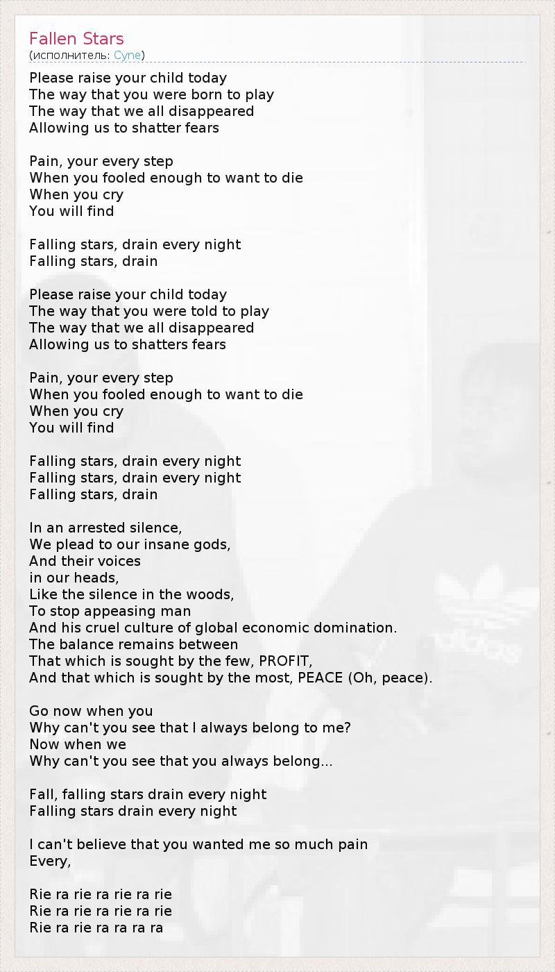 Прошу, воспитывайте своего ребенка сегодня Так, словно вы родились для игр, Способом, из-за которого мы все исчезаем, Позвольте нам развеять наши страхи. Боль на каждом шагу, Когда тебя дурачат настолько, что хочется умереть. Когда ты заплачешь, Ты сможешь найти... Падающие звезды осушают каждую ночь, Падающие звезды истощают... Прошу, воспитывайте своего ребенка сегодня Так, словно вы родились для игр, Способом, из-за которого мы все исчезаем, Позвольте нам развеять наши страхи. Боль на каждом шагу, Когда тебя дурачат настолько, что хочется умереть. Когда ты заплачешь, Ты сможешь найти... Падающие звезды осушают каждую ночь, Падающие звезды осушают каждую ночь, Падающие звезды истощают... В безмолвной тишине Мы молимся нашим безумным богам И их голоса В наших головах Словно в лесной тиши. Хватит потакать человеку С его жестокой культурой экономического, мирового господства Баланс останется между Тем, что ищут немногие - прибылью, И тем, что гораздо важнее - миром, о мир... Идём же теперь, когда вы Как вы не понимаете, что я всегда сам по себе? Теперь, когда мы... Как вы не понимаете, что вы всегда связаны с... Падают, падающие звезды осушают каждую ночь, Падающие звезды истощают каждую ночь... Не могу поверить, что ты желаешь мне столько боли! Каждый, Рай ра ри ра рай ра ри Рай ра ри ра рай ра ри Рай ра ри ра ра ра ра