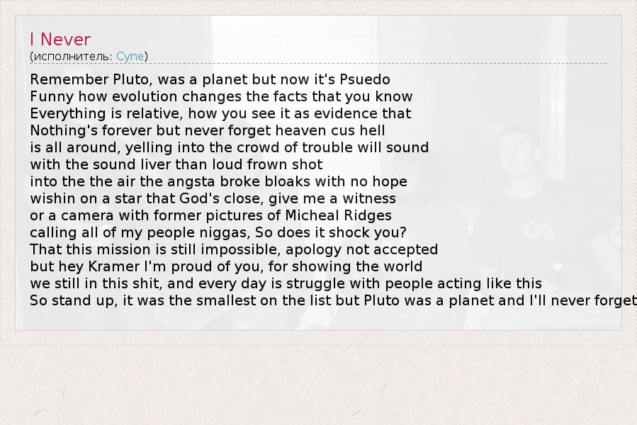 Remember Pluto, was a planet but now it's Psuedo Funny how evolution changes the facts that you know Everything is relative, how you see it as evidence that Nothing's forever but never forget heaven cus hell is all around, yelling into the crowd of trouble will sound with the sound liver than loud frown shot into the the air the angsta broke bloaks with no hope wishin on a star that God's close, give me a witness or a camera with former pictures of Micheal Ridges calling all of my people niggas, So does it shock you? That this mission is still impossible, apology not accepted but hey Kramer I'm proud of you, for showing the world we still in this shit, and every day is struggle with people acting like this So stand up, it was the smallest on the list but Pluto was a planet and I'll never forget
