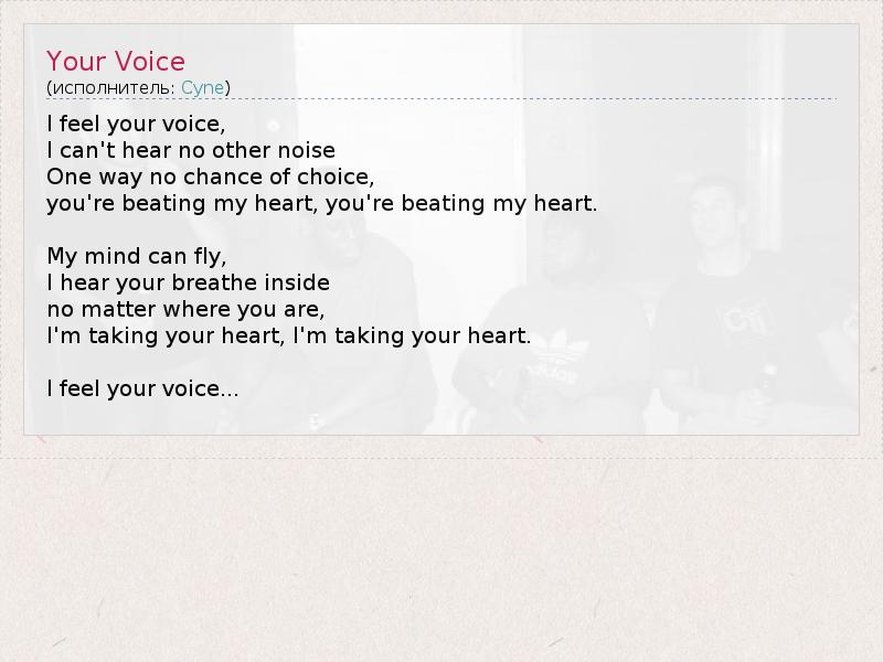 I feel your voice, I can't hear no other noise One way no chance of choice, you're beating my heart, you're beating my heart. My mind can fly, I hear your breathe inside no matter where you are, I'm taking your heart, I'm taking your heart. I feel your voice...
