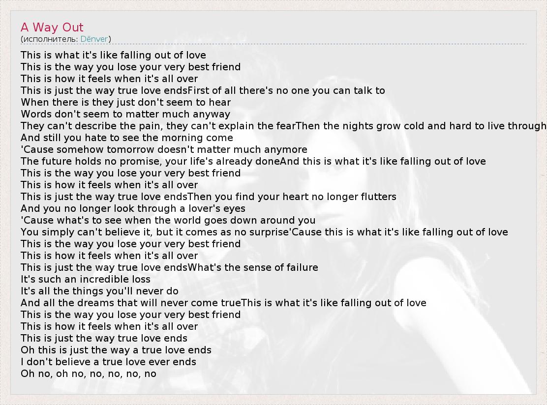 This is what it's like falling out of love This is the way you lose your very best friend This is how it feels when it's all over This is just the way true love endsFirst of all there's no one you can talk to When there is they just don't seem to hear Words don't seem to matter much anyway They can't describe the pain, they can't explain the fearThen the nights grow cold and hard to live through And still you hate to see the morning come 'Cause somehow tomorrow doesn't matter much anymore The future holds no promise, your life's already doneAnd this is what it's like falling out of love This is the way you lose your very best friend This is how it feels when it's all over This is just the way true love endsThen you find your heart no longer flutters And you no longer look through a lover's eyes 'Cause what's to see when the world goes down around you You simply can't believe it, but it comes as no surprise'Cause this is what it's like falling out of love This is the way you lose your very best friend This is how it feels when it's all over This is just the way true love endsWhat's the sense of failure It's such an incredible loss It's all the things you'll never do And all the dreams that will never come trueThis is what it's like falling out of love This is the way you lose your very best friend This is how it feels when it's all over This is just the way true love ends Oh this is just the way a true love ends I don't believe a true love ever ends Oh no, oh no, no, no, no, no