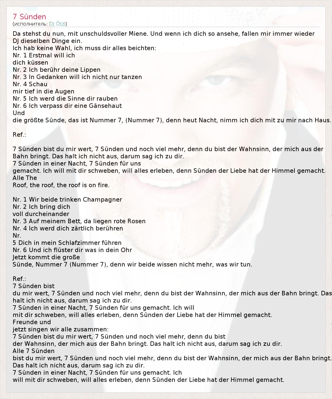 Da stehst du nun, mit unschuldsvoller Miene. Und wenn ich dich so ansehe, fallen mir immer wieder DJ dieselben Dinge ein. Ich hab keine Wahl, ich muss dir alles beichten: Nr. 1 Erstmal will ich dich küssen Nr. 2 Ich berühr deine Lippen Nr. 3 In Gedanken will ich nicht nur tanzen Nr. 4 Schau mir tief in die Augen Nr. 5 Ich werd die Sinne dir rauben Nr. 6 Ich verpass dir eine Gänsehaut Und die größte Sünde, das ist Nummer 7, (Nummer 7), denn heut Nacht, nimm ich dich mit zu mir nach Haus. Ref.: 7 Sünden bist du mir wert, 7 Sünden und noch viel mehr, denn du bist der Wahnsinn, der mich aus der Bahn bringt. Das halt ich nicht aus, darum sag ich zu dir. 7 Sünden in einer Nacht, 7 Sünden für uns gemacht. Ich will mit dir schweben, will alles erleben, denn Sünden der Liebe hat der Himmel gemacht. Alle The Roof, the roof, the roof is on fire. Nr. 1 Wir beide trinken Champagner Nr. 2 Ich bring dich voll durcheinander Nr. 3 Auf meinem Bett, da liegen rote Rosen Nr. 4 Ich werd dich zärtlich berühren Nr. 5 Dich in mein Schlafzimmer führen Nr. 6 Und ich flüster dir was in dein Ohr Jetzt kommt die große Sünde, Nummer 7 (Nummer 7), denn wir beide wissen nicht mehr, was wir tun. Ref.: 7 Sünden bist du mir wert, 7 Sünden und noch viel mehr, denn du bist der Wahnsinn, der mich aus der Bahn bringt. Das halt ich nicht aus, darum sag ich zu dir. 7 Sünden in einer Nacht, 7 Sünden für uns gemacht. Ich will mit dir schweben, will alles erleben, denn Sünden der Liebe hat der Himmel gemacht. Freunde und jetzt singen wir alle zusammen: 7 Sünden bist du mir wert, 7 Sünden und noch viel mehr, denn du bist der Wahnsinn, der mich aus der Bahn bringt. Das halt ich nicht aus, darum sag ich zu dir. Alle 7 Sünden bist du mir wert, 7 Sünden und noch viel mehr, denn du bist der Wahnsinn, der mich aus der Bahn bringt. Das halt ich nicht aus, darum sag ich zu dir. 7 Sünden in einer Nacht, 7 Sünden für uns gemacht. Ich will mit dir schweben, will alles erleben, denn Sünden der Liebe hat der Himmel gemacht.