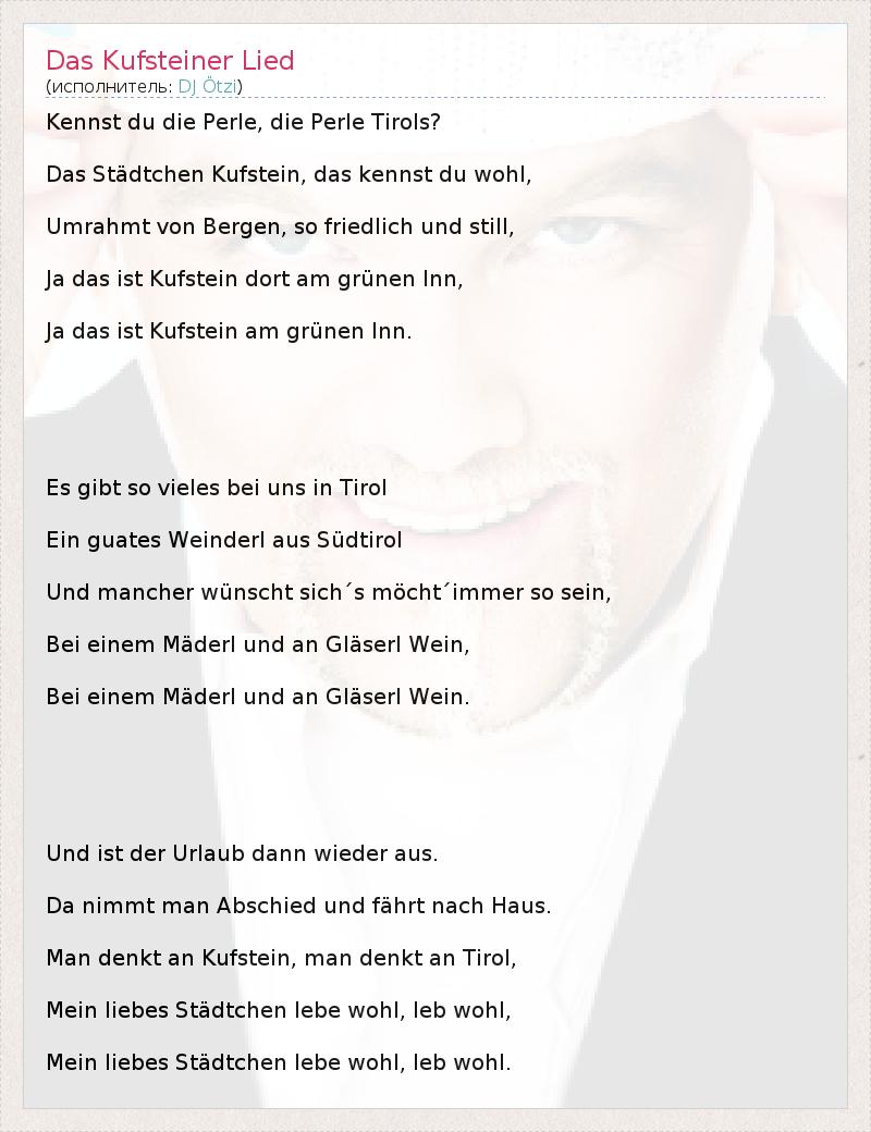 Kennst du die Perle, die Perle Tirols? Das Städtchen Kufstein, das kennst du wohl, Umrahmt von Bergen, so friedlich und still, Ja das ist Kufstein dort am grünen Inn, Ja das ist Kufstein am grünen Inn. Es gibt so vieles bei uns in Tirol Ein guates Weinderl aus Südtirol Und mancher wünscht sich´s möcht´immer so sein, Bei einem Mäderl und an Gläserl Wein, Bei einem Mäderl und an Gläserl Wein. Und ist der Urlaub dann wieder aus. Da nimmt man Abschied und fährt nach Haus. Man denkt an Kufstein, man denkt an Tirol, Mein liebes Städtchen lebe wohl, leb wohl, Mein liebes Städtchen lebe wohl, leb wohl.