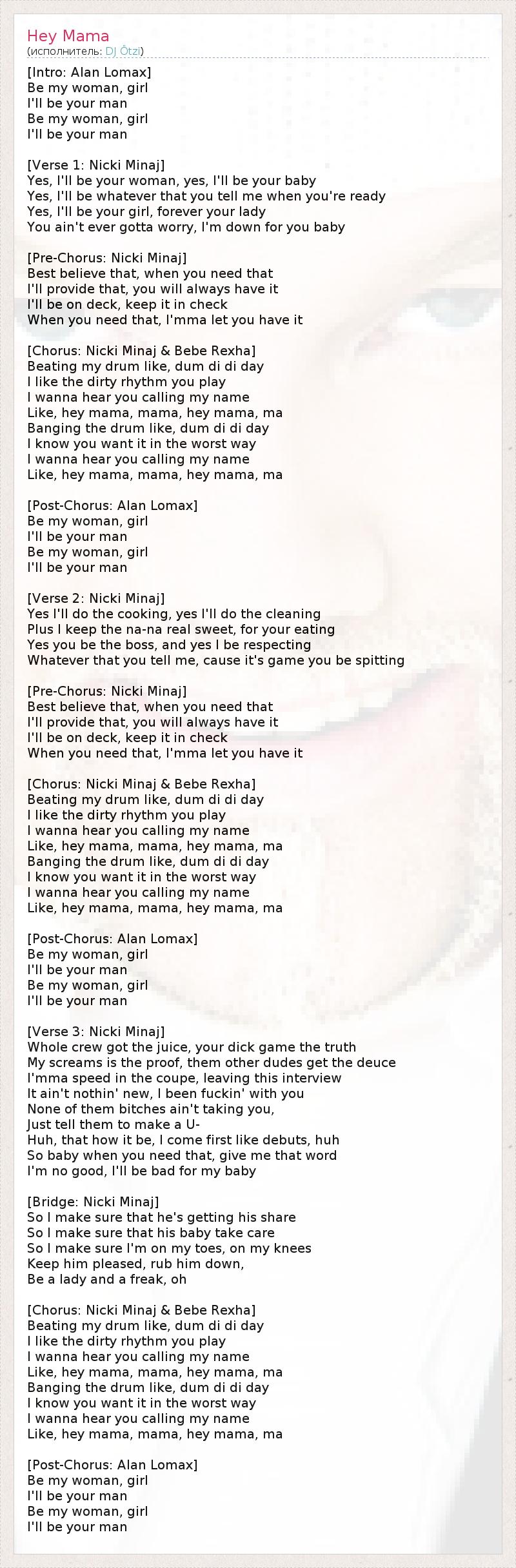 [Intro: Alan Lomax] Be my woman, girl I'll be your man Be my woman, girl I'll be your man [Verse 1: Nicki Minaj] Yes, I'll be your woman, yes, I'll be your baby Yes, I'll be whatever that you tell me when you're ready Yes, I'll be your girl, forever your lady You ain't ever gotta worry, I'm down for you baby [Pre-Chorus: Nicki Minaj] Best believe that, when you need that I'll provide that, you will always have it I'll be on deck, keep it in check When you need that, I'mma let you have it [Chorus: Nicki Minaj & Bebe Rexha] Beating my drum like, dum di di day I like the dirty rhythm you play I wanna hear you calling my name Like, hey mama, mama, hey mama, ma Banging the drum like, dum di di day I know you want it in the worst way I wanna hear you calling my name Like, hey mama, mama, hey mama, ma [Post-Chorus: Alan Lomax] Be my woman, girl I'll be your man Be my woman, girl I'll be your man [Verse 2: Nicki Minaj] Yes I'll do the cooking, yes I'll do the cleaning Plus I keep the na-na real sweet, for your eating Yes you be the boss, and yes I be respecting Whatever that you tell me, cause it's game you be spitting [Pre-Chorus: Nicki Minaj] Best believe that, when you need that I'll provide that, you will always have it I'll be on deck, keep it in check When you need that, I'mma let you have it [Chorus: Nicki Minaj & Bebe Rexha] Beating my drum like, dum di di day I like the dirty rhythm you play I wanna hear you calling my name Like, hey mama, mama, hey mama, ma Banging the drum like, dum di di day I know you want it in the worst way I wanna hear you calling my name Like, hey mama, mama, hey mama, ma [Post-Chorus: Alan Lomax] Be my woman, girl I'll be your man Be my woman, girl I'll be your man [Verse 3: Nicki Minaj] Whole crew got the juice, your dick game the truth My screams is the proof, them other dudes get the deuce I'mma speed in the coupe, leaving this interview It ain't nothin' new, I been fuckin' with you None of them bitches ain't taking you, Just tell them to make a U- Huh, that how it be, I come first like debuts, huh So baby when you need that, give me that word I'm no good, I'll be bad for my baby [Bridge: Nicki Minaj] So I make sure that he's getting his share So I make sure that his baby take care So I make sure I'm on my toes, on my knees Keep him pleased, rub him down, Be a lady and a freak, oh [Chorus: Nicki Minaj & Bebe Rexha] Beating my drum like, dum di di day I like the dirty rhythm you play I wanna hear you calling my name Like, hey mama, mama, hey mama, ma Banging the drum like, dum di di day I know you want it in the worst way I wanna hear you calling my name Like, hey mama, mama, hey mama, ma [Post-Chorus: Alan Lomax] Be my woman, girl I'll be your man Be my woman, girl I'll be your man