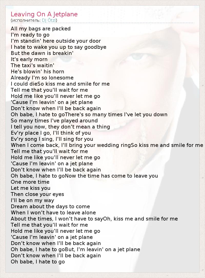 All my bags are packed I'm ready to go I'm standin' here outside your door I hate to wake you up to say goodbye But the dawn is breakin' It's early morn The taxi's waitin' He's blowin' his horn Already I'm so lonesome I could dieSo kiss me and smile for me Tell me that you'll wait for me Hold me like you'll never let me go 'Cause I'm leavin' on a jet plane Don't know when I'll be back again Oh babe, I hate to goThere's so many times I've let you down So many times I've played around I tell you now, they don't mean a thing Ev'ry place I go, I'll think of you Ev'ry song I sing, I'll sing for you When I come back, I'll bring your wedding ringSo kiss me and smile for me Tell me that you'll wait for me Hold me like you'll never let me go 'Cause I'm leavin' on a jet plane Don't know when I'll be back again Oh babe, I hate to goNow the time has come to leave you One more time Let me kiss you Then close your eyes I'll be on my way Dream about the days to come When I won't have to leave alone About the times, I won't have to sayOh, kiss me and smile for me Tell me that you'll wait for me Hold me like you'll never let me go 'Cause I'm leavin' on a jet plane Don't know when I'll be back again Oh babe, I hate to goBut, I'm leavin' on a jet plane Don't know when I'll be back again Oh babe, I hate to go