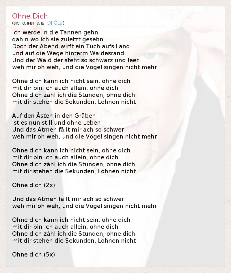 Ich werde in die Tannen gehn dahin wo ich sie zuletzt gesehn Doch der Abend wirft ein Tuch aufs Land und auf die Wege hinterm Waldesrand Und der Wald der steht so schwarz und leer weh mir oh weh, und die Vögel singen nicht mehr Ohne dich kann ich nicht sein, ohne dich mit dir bin ich auch allein, ohne dich Ohne dich zähl ich die Stunden, ohne dich mit dir stehen die Sekunden, Lohnen nicht Auf den Ästen in den Gräben ist es nun still und ohne Leben Und das Atmen fällt mir ach so schwer weh mir oh weh, und die Vögel singen nicht mehr Ohne dich kann ich nicht sein, ohne dich mit dir bin ich auch allein, ohne dich Ohne dich zähl ich die Stunden, ohne dich mit dir stehen die Sekunden, Lohnen nicht Ohne dich (2x) Und das Atmen fällt mir ach so schwer weh mir oh weh, und die Vögel singen nicht mehr Ohne dich kann ich nicht sein, ohne dich mit dir bin ich auch allein, ohne dich Ohne dich zähl ich die Stunden, ohne dich mit dir stehen die Sekunden, Lohnen nicht Ohne dich (5x)