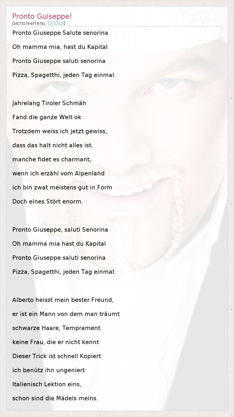 Pronto Giuseppe Salute senorina Oh mamma mia, hast du Kapital Pronto Giuseppe saluti senorina Pizza, Spagetthi, jeden Tag einmal. Jahrelang Tiroler Schmäh Fand die ganze Welt ok Trotzdem weiss ich jetzt gewiss, dass das halt nicht alles ist. manche fidet es charmant, wenn ich erzähl vom Alpenland ich bin zwat meistens gut in Form Doch eines Stört enorm. Pronto Giuseppe, saluti Senorina Oh mamma mia hast du Kapital Pronto Giuseppe saluti senorina Pizza, Spagetthi, jeden Tag einmal. Alberto heisst mein bester Freund, er ist ein Mann von dem man träumt schwarze Haare, Temprament keine Frau, die er nicht kennt Dieser Trick ist schnell Kopiert ich benütz ihn ungeniert Italienisch Lektion eins, schon sind die Mädels meins.