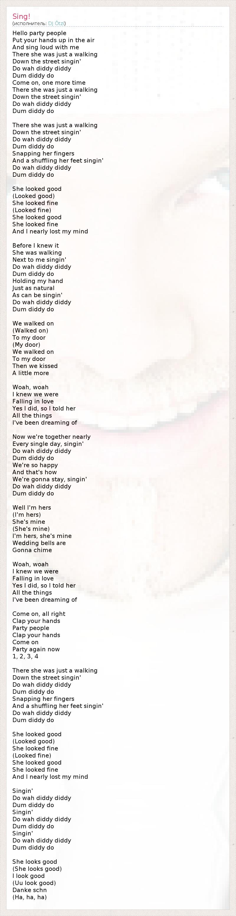 Hello party people Put your hands up in the air And sing loud with me There she was just a walking Down the street singin' Do wah diddy diddy Dum diddy do Come on, one more time There she was just a walking Down the street singin' Do wah diddy diddy Dum diddy do There she was just a walking Down the street singin' Do wah diddy diddy Dum diddy do Snapping her fingers And a shuffling her feet singin' Do wah diddy diddy Dum diddy do She looked good (Looked good) She looked fine (Looked fine) She looked good She looked fine And I nearly lost my mind Before I knew it She was walking Next to me singin' Do wah diddy diddy Dum diddy do Holding my hand Just as natural As can be singin' Do wah diddy diddy Dum diddy do We walked on (Walked on) To my door (My door) We walked on To my door Then we kissed A little more Woah, woah I knew we were Falling in love Yes I did, so I told her All the things I've been dreaming of Now we're together nearly Every single day, singin' Do wah diddy diddy Dum diddy do We're so happy And that's how We're gonna stay, singin' Do wah diddy diddy Dum diddy do Well I'm hers (I'm hers) She's mine (She's mine) I'm hers, she's mine Wedding bells are Gonna chime Woah, woah I knew we were Falling in love Yes I did, so I told her All the things I've been dreaming of Come on, all right Clap your hands Party people Clap your hands Come on Party again now 1, 2, 3, 4 There she was just a walking Down the street singin' Do wah diddy diddy Dum diddy do Snapping her fingers And a shuffling her feet singin' Do wah diddy diddy Dum diddy do She looked good (Looked good) She looked fine (Looked fine) She looked good She looked fine And I nearly lost my mind Singin' Do wah diddy diddy Dum diddy do Singin' Do wah diddy diddy Dum diddy do Singin' Do wah diddy diddy Dum diddy do She looks good (She looks good) I look good (Uu look good) Danke schn (Ha, ha, ha)