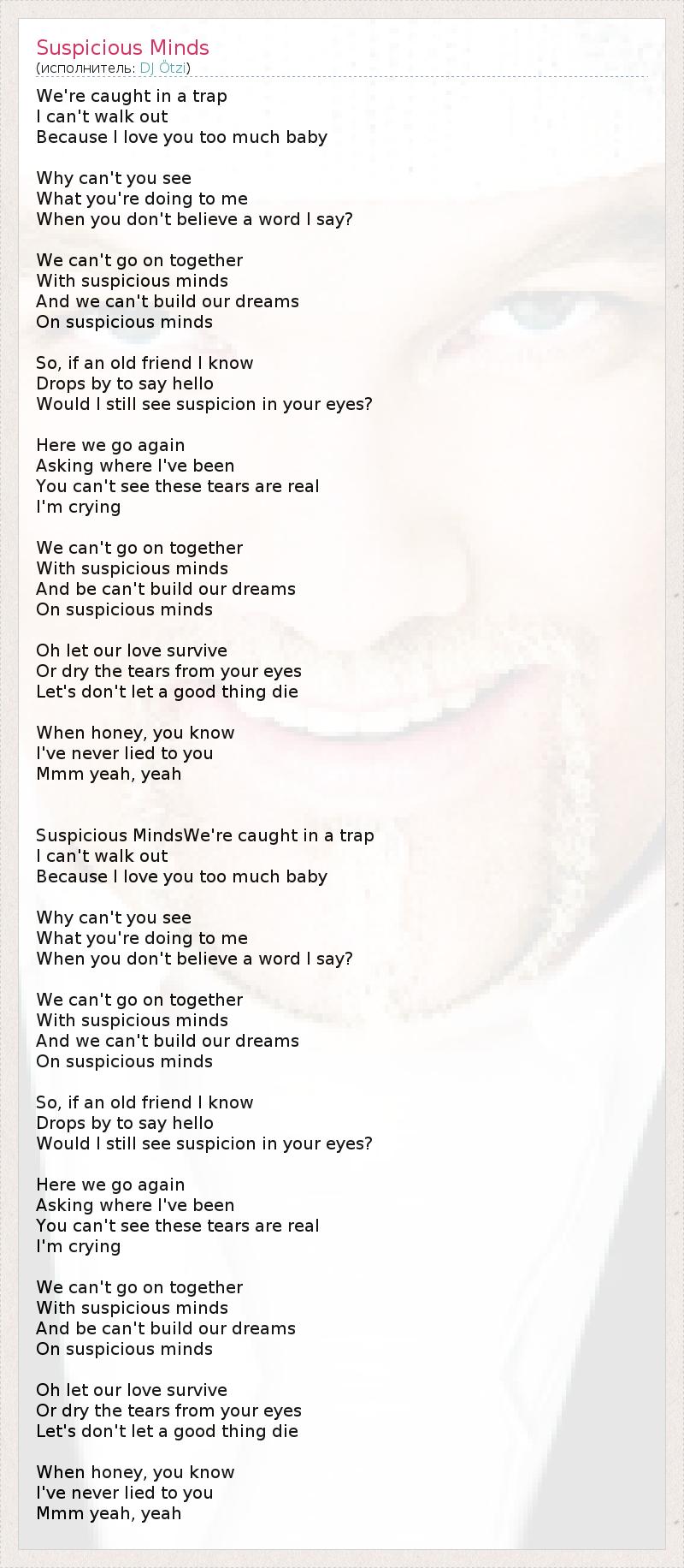 We're caught in a trap I can't walk out Because I love you too much baby Why can't you see What you're doing to me When you don't believe a word I say? We can't go on together With suspicious minds And we can't build our dreams On suspicious minds So, if an old friend I know Drops by to say hello Would I still see suspicion in your eyes? Here we go again Asking where I've been You can't see these tears are real I'm crying We can't go on together With suspicious minds And be can't build our dreams On suspicious minds Oh let our love survive Or dry the tears from your eyes Let's don't let a good thing die When honey, you know I've never lied to you Mmm yeah, yeah Suspicious MindsWe're caught in a trap I can't walk out Because I love you too much baby Why can't you see What you're doing to me When you don't believe a word I say? We can't go on together With suspicious minds And we can't build our dreams On suspicious minds So, if an old friend I know Drops by to say hello Would I still see suspicion in your eyes? Here we go again Asking where I've been You can't see these tears are real I'm crying We can't go on together With suspicious minds And be can't build our dreams On suspicious minds Oh let our love survive Or dry the tears from your eyes Let's don't let a good thing die When honey, you know I've never lied to you Mmm yeah, yeah