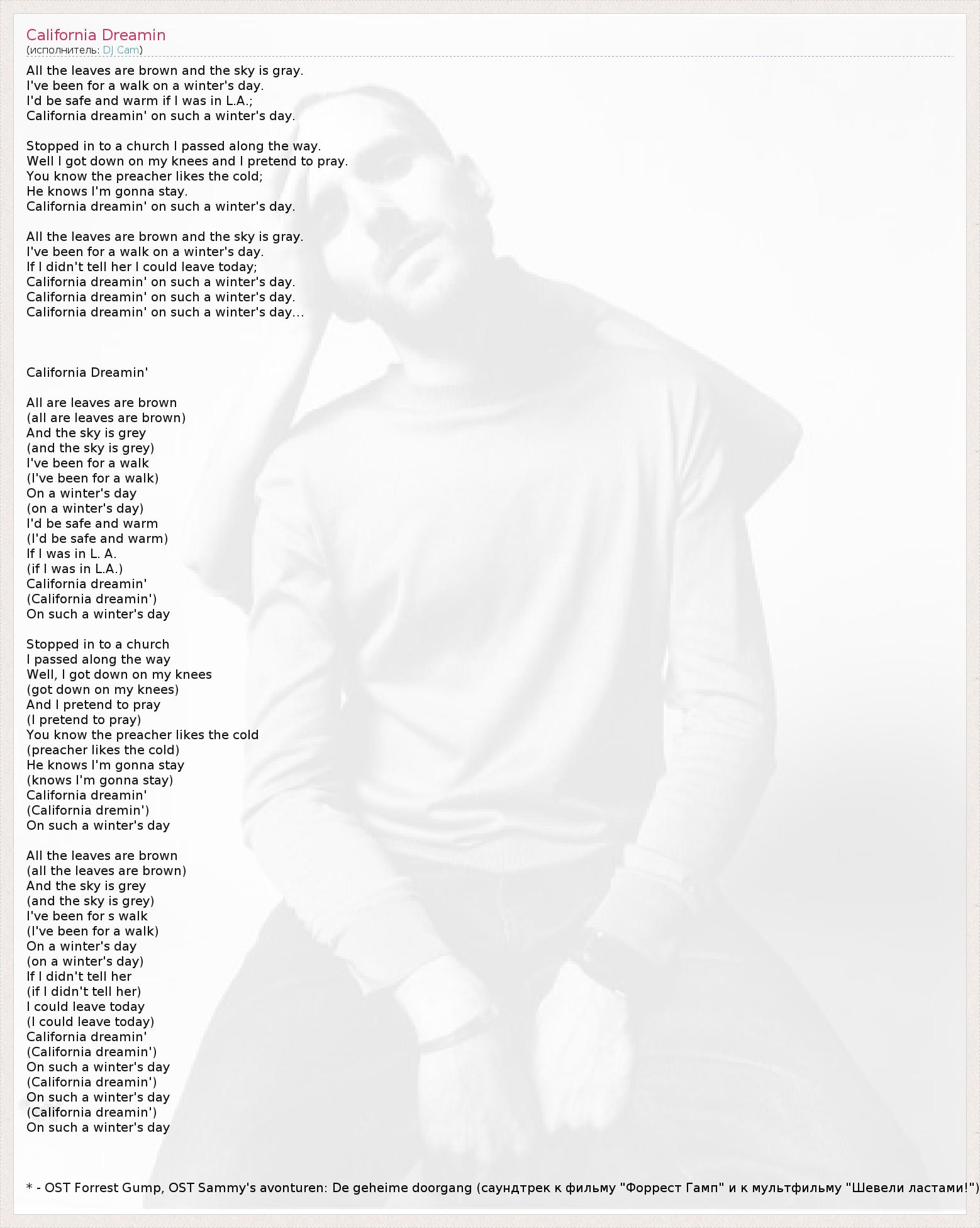 All the leaves are brown and the sky is gray. I've been for a walk on a winter's day. I'd be safe and warm if I was in L.A.; California dreamin' on such a winter's day. Stopped in to a church I passed along the way. Well I got down on my knees and I pretend to pray. You know the preacher likes the cold; He knows I'm gonna stay. California dreamin' on such a winter's day. All the leaves are brown and the sky is gray. I've been for a walk on a winter's day. If I didn't tell her I could leave today; California dreamin' on such a winter's day. California dreamin' on such a winter's day. California dreamin' on such a winter's day… California Dreamin' All are leaves are brown (all are leaves are brown) And the sky is grey (and the sky is grey) I've been for a walk (I've been for a walk) On a winter's day (on a winter's day) I'd be safe and warm (I'd be safe and warm) If I was in L. A. (if I was in L.A.) California dreamin' (California dreamin') On such a winter's day Stopped in to a church I passed along the way Well, I got down on my knees (got down on my knees) And I pretend to prаy (I pretend to prаy) You know the preacher likes the cold (preacher likes the cold) He knows I'm gonna stay (knows I'm gonna stay) California dreamin' (California dremin') On such a winter's day All the leaves are brown (all the leaves are brown) And the sky is grey (and the sky is grey) I've been for s walk (I've been for a walk) On a winter's day (on a winter's day) If I didn't tell her (if I didn't tell her) I could leave today (I could leave today) California dreamin' (California dreamin') On such a winter's day (California dreamin') On such a winter's day (California dreamin') On such a winter's day * - OST Forrest Gump, OST Sammy's avonturen: De geheime doorgang (cаундтрек к фильму "Форрест Гамп" и к мультфильму "Шевели ластами!")