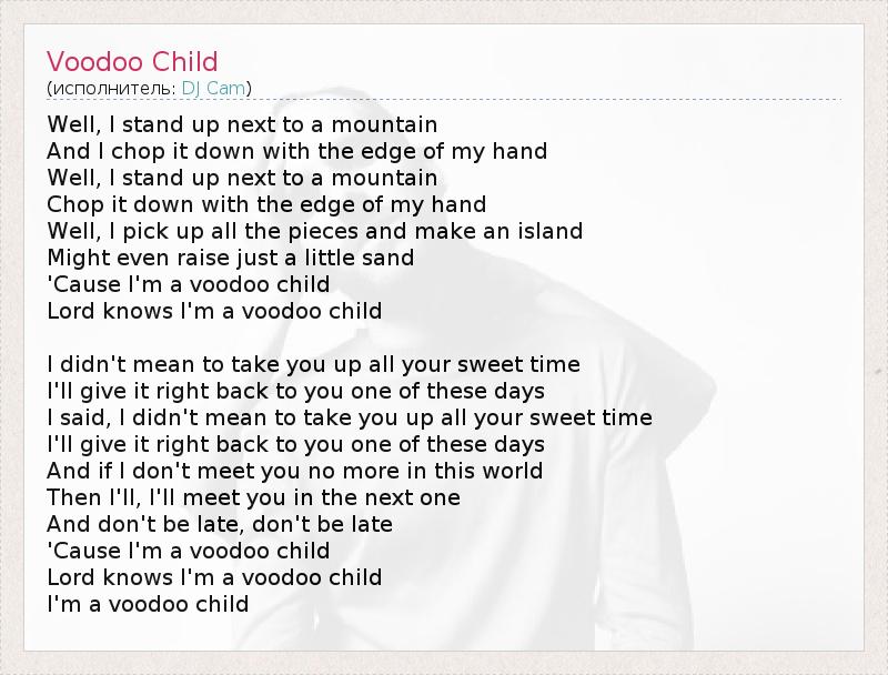 Well, I stand up next to a mountain And I chop it down with the edge of my hand Well, I stand up next to a mountain Chop it down with the edge of my hand Well, I pick up all the pieces and make an island Might even raise just a little sand 'Cause I'm a voodoo child Lord knows I'm a voodoo child I didn't mean to take you up all your sweet time I'll give it right back to you one of these days I said, I didn't mean to take you up all your sweet time I'll give it right back to you one of these days And if I don't meet you no more in this world Then I'll, I'll meet you in the next one And don't be late, don't be late 'Cause I'm a voodoo child Lord knows I'm a voodoo child I'm a voodoo child